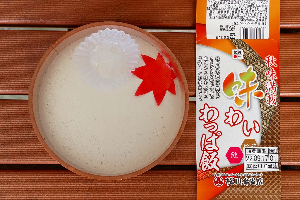 楕円形の容器に炊き込み御飯を詰め、くり、肉団子、さつまいも、タケノコ、マイタケ、野沢菜、ごぼう、しいたけ、ふき、にんじんを散らす。にぎわいや、わっぱめしというよりは、まるで山菜が入っているような栗飯という印象。ひと昔前に東北地方で「山菜栗ごはん」の名前で売られた秋限定の駅弁だと言われれば信じてしまいそうな雰囲気を覚えた。