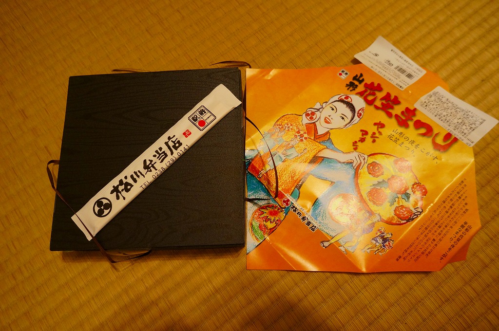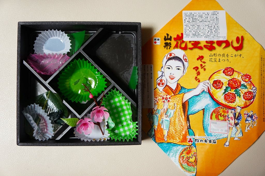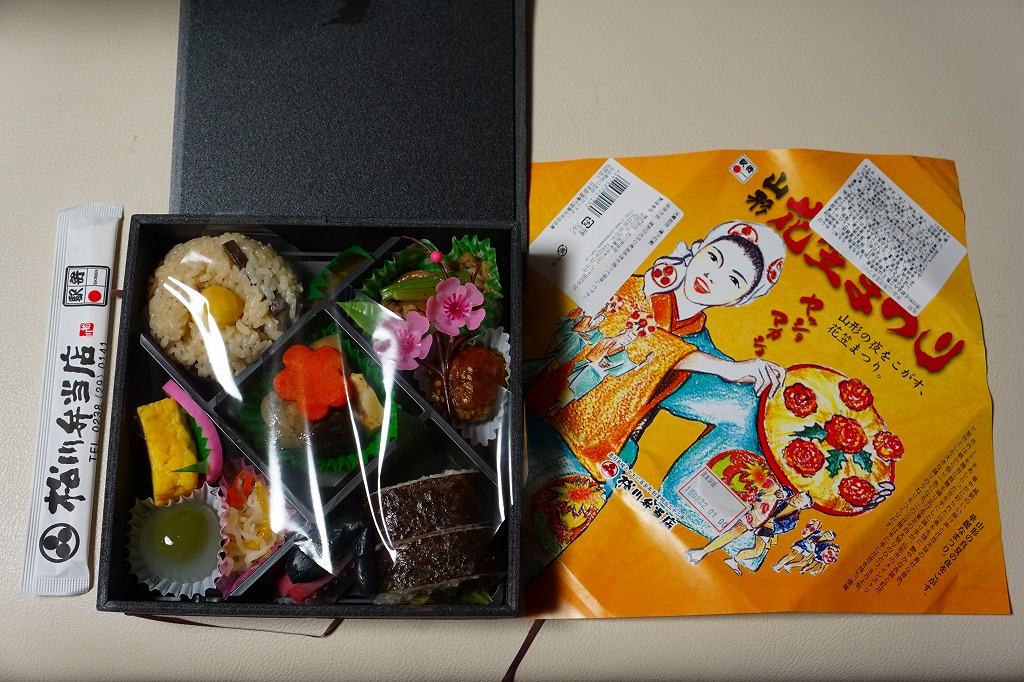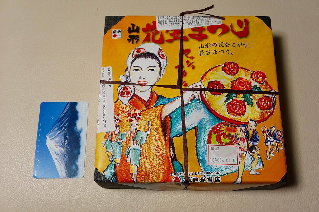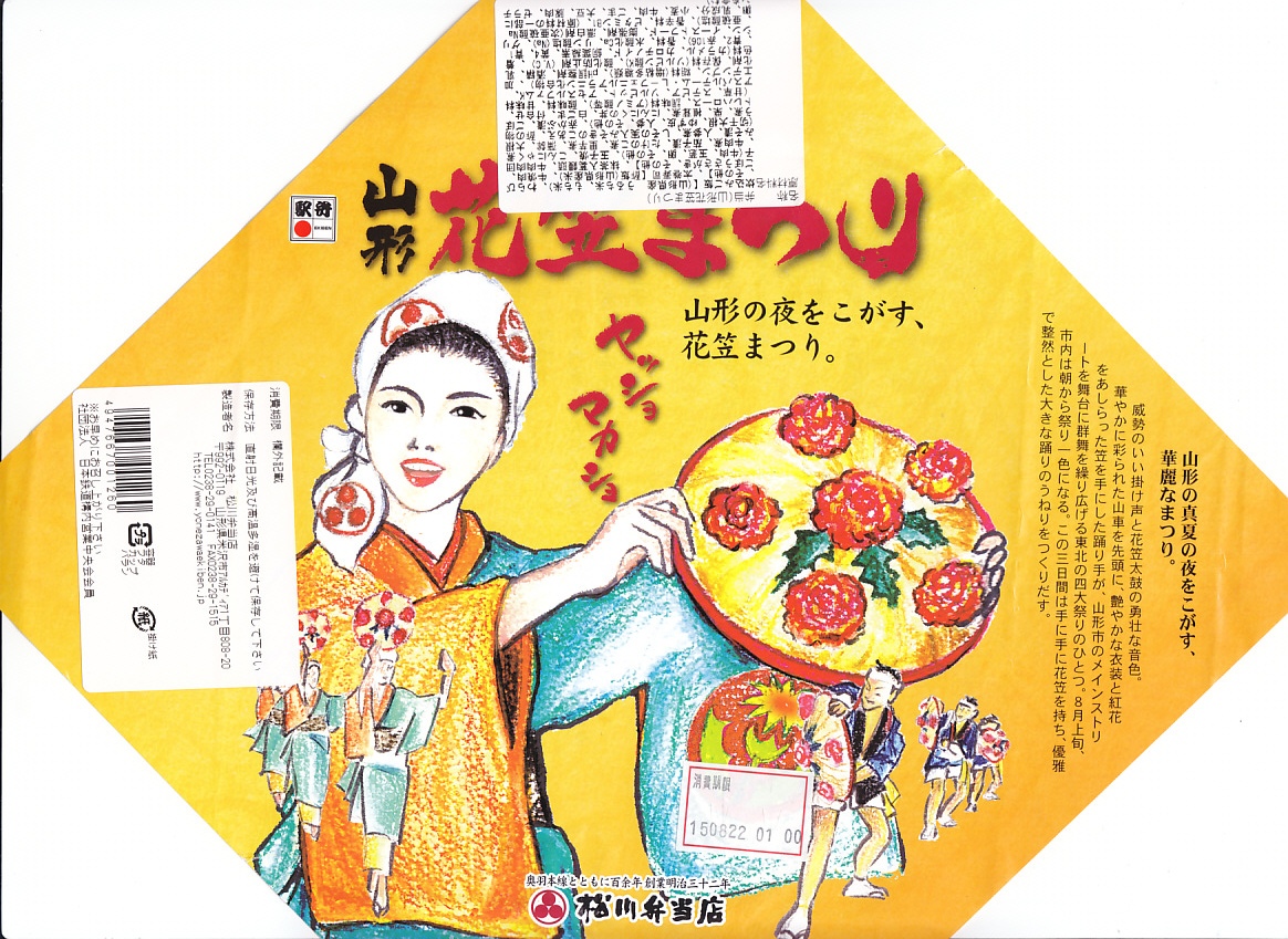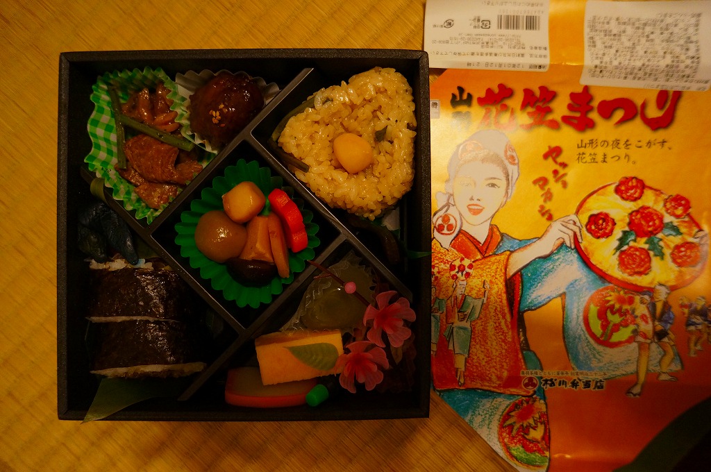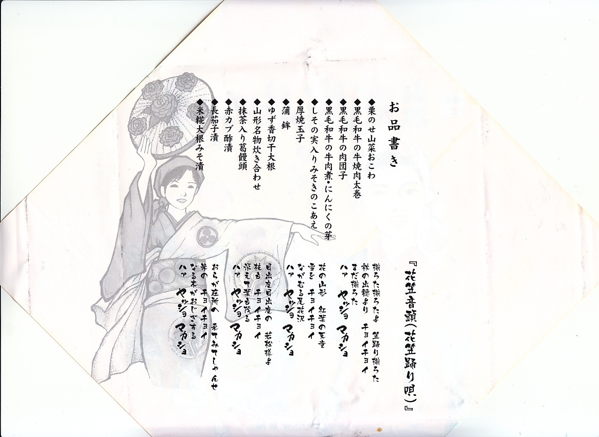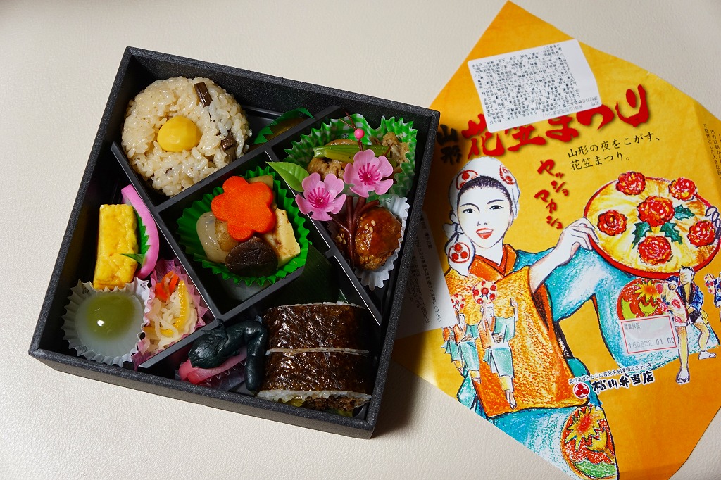 2012(平成24)年1月の京王百貨店の駅弁大会で輸送販売されたお弁当。既存の米沢駅弁「戦国幕の内弁当」とまったく同じ容器を、山形の花笠まつりを描いた掛紙で包む。中身は牛肉太巻、栗山菜おこわにぎり、牛肉団子、牛焼肉、根菜などの煮物、かまぼこ、玉子焼など。駅弁の名前から、てっきり山形駅の駅弁だと思った。駅弁の名前や掛紙からは思い付かぬ力強い内容と風味だった。価格は発売時で1,100円、2015年時点で1,200円。2015年頃までの販売か。