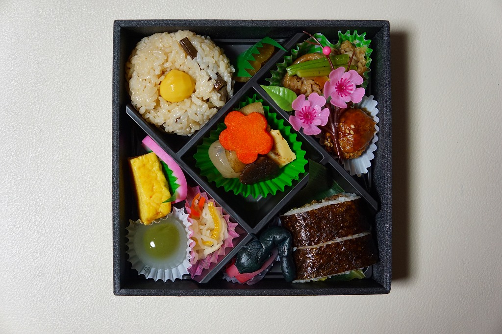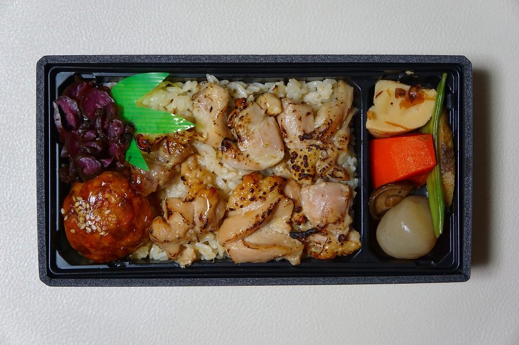 焼き鳥のイメージ写真が美しい掛紙に包まれた長方形の容器に、生姜飯を詰め、ゆず胡椒で味付けた焼き鳥を並べ、肉団子と柴漬けも載せ、ニンジンやタケノコなどの煮物と玉こんにゃくを添える。柑橘系プラスαの香りがする、視覚では感じ取れない所にある個性が印象的だった。