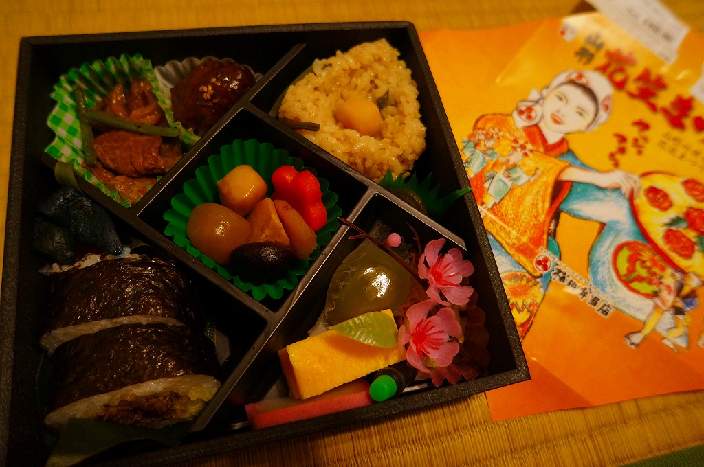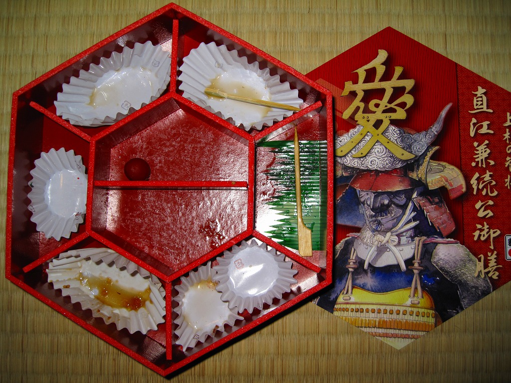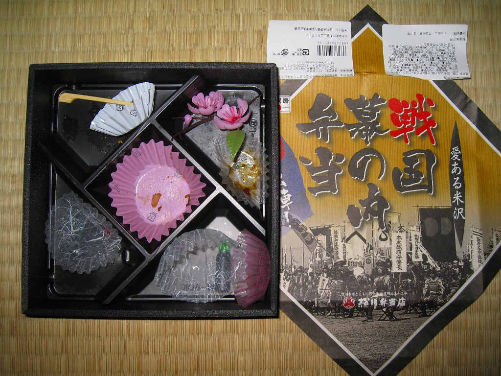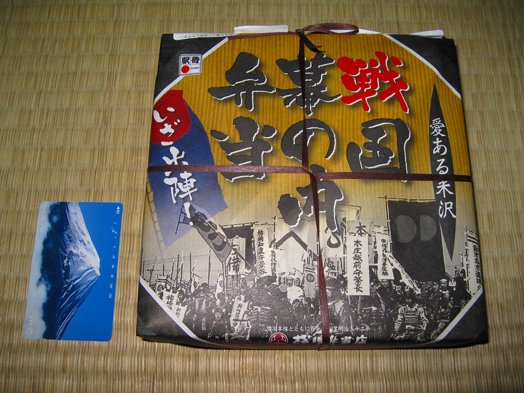 普段はどれもシンプルな米沢駅弁らしくない、なかなか複雑な内容。現地では一日5個ないし10個で登場したそうだが、おそらく関東の「駅弁屋旨囲門」にはそれ以上の数量が出荷されているのでは。NHK大河ドラマは日本全国で視聴されるとはいえ、これは米沢の駅弁だと思ってはならないのかもしれない。2010年以降は完全予約制とされる。2011年までの販売か。