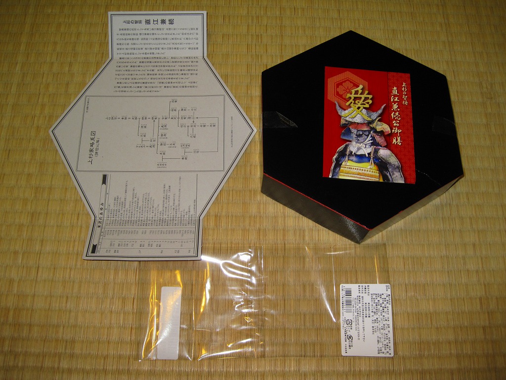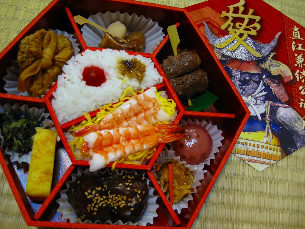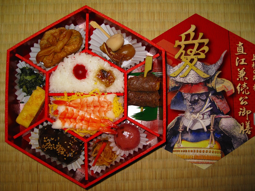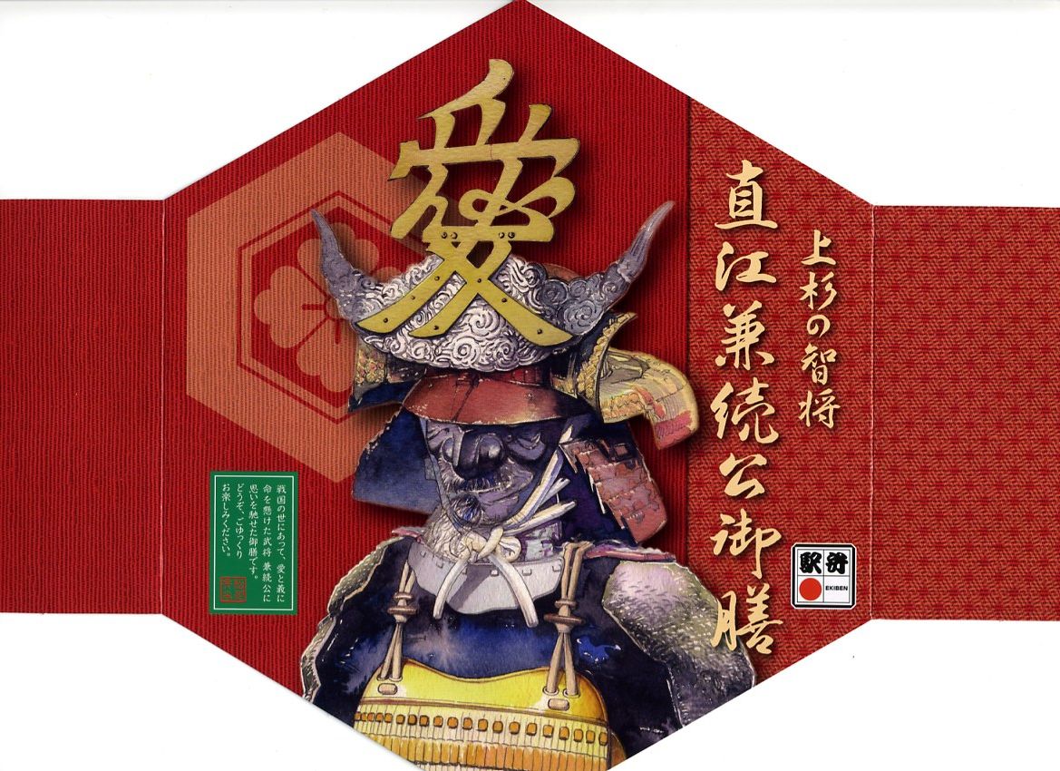 2009(平成21)年のNHK大河ドラマ「天地人」にちなんで、同年の3月1日に発売。正六角形で黒塗りの容器におしながきを置き、表面に直江兼続を、裏面に解説文と家系図を印刷したボール紙でふたをして、ラップの帯で留める。中身は中央に日の丸御飯と蒸し海老のちらし寿司を配し、その周囲を棒だら煮に玉こんと里芋の串刺し、米沢牛串、梅しそ団子と松前漬、米沢牛肉団子、玉子焼とおみ漬、巾着煮で囲む。