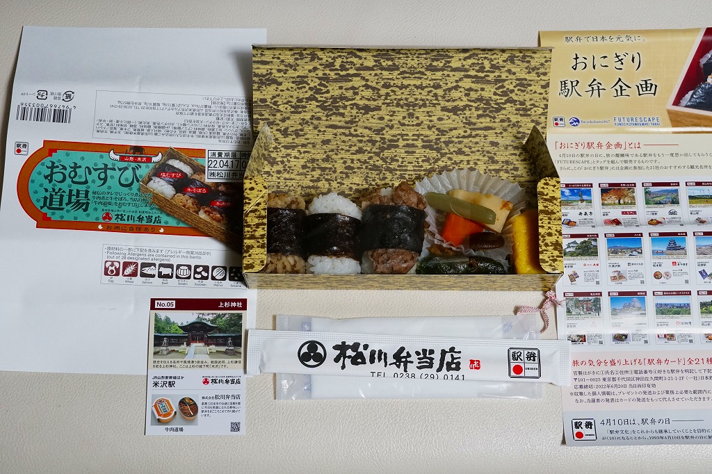 2022(令和4)年4月10日から5月10日まで、米沢、山形、仙台、東京、上野、大宮の各駅で販売。駅弁の日に合わせ、日本鉄道構内営業中央会の会員のうち21社が、FMヨコハマのラジオ番組「FUTURESCAPE」とタイアップし、この年の4月10日から各社の駅売店などで販売した、駅弁の日記念のおにぎり駅弁の、米沢駅バージョンとして販売。今回のキャンペーンで各社に用意された「駅弁カード」が1枚付いてきた。