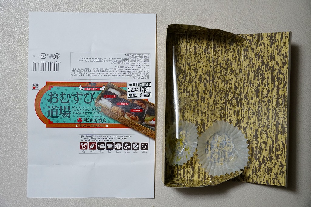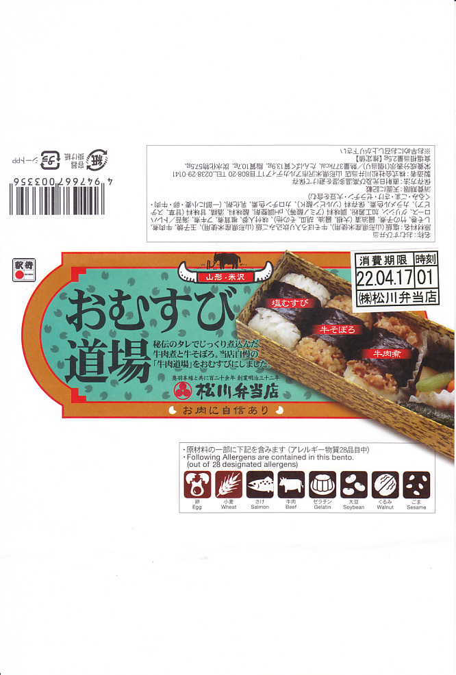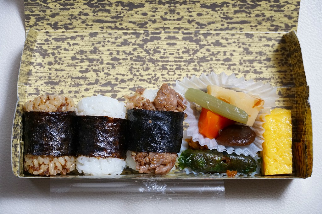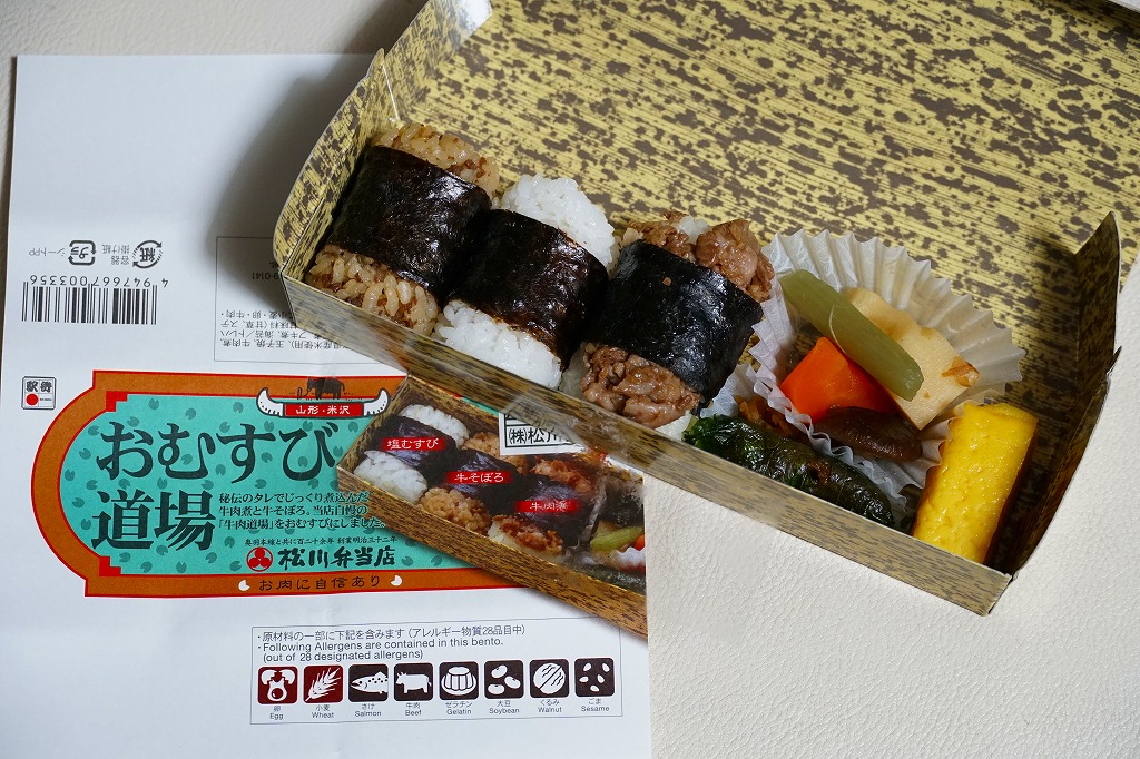 中身と商品名を描く掛紙の絵柄は、発売30年の米沢駅弁「牛肉道場」に似る。中身は俵飯に海苔を締めた牛そぼろおむすび、牛肉煮おむすび、塩おむすびが各1個と、玉子焼き、しそ巻、煮物、漬物であり、「牛肉道場」に少し似る。味も同じだと思うが、牛肉の分量が何倍も違うから、印象は異なる。