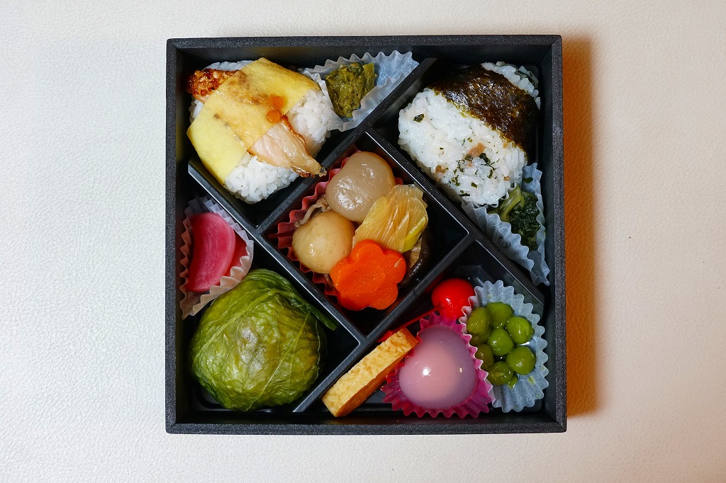 おにぎり弁当らしからぬ大きさを持つ、普通サイズの黒い正方形の容器に、中身の写真やこのキャンペーンに共通の駅弁マークを載せた掛紙を巻く。中身はめはり、サーモン、混ぜ御飯で3個のおむすび、いも煮と漬物、玉子焼、うぐいす豆、さくらんぼ、水まんじゅう。分量たっぷり、お値段ひかえめでお買い得。1年間の販売か。