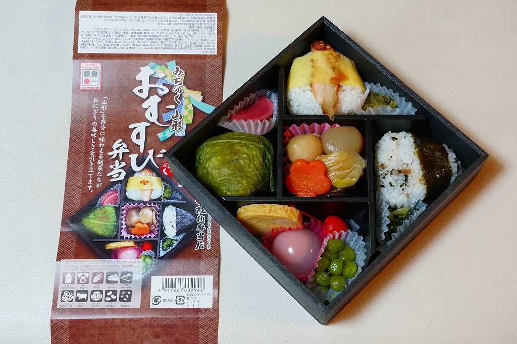 小さな長方形の容器に、ふき味噌、うめ、弁慶めしで各1個の三角おにぎりと、玉子焼、牛肉煮、漬物。千円+消費税の高価格は、1週間限りの記念商品であり、仙台駅や東京駅で千数百円の駅弁群に囲まれれば目立たない。解説なく詰めた「弁慶めし」とは。山形県内で米沢のある置賜(おきたま)地域でなく日本海側の庄内地域の郷土料理だそうで、握り飯に味噌を塗り青菜漬で巻いて焼いたもの。和歌山のめはりずしのような感じ。
