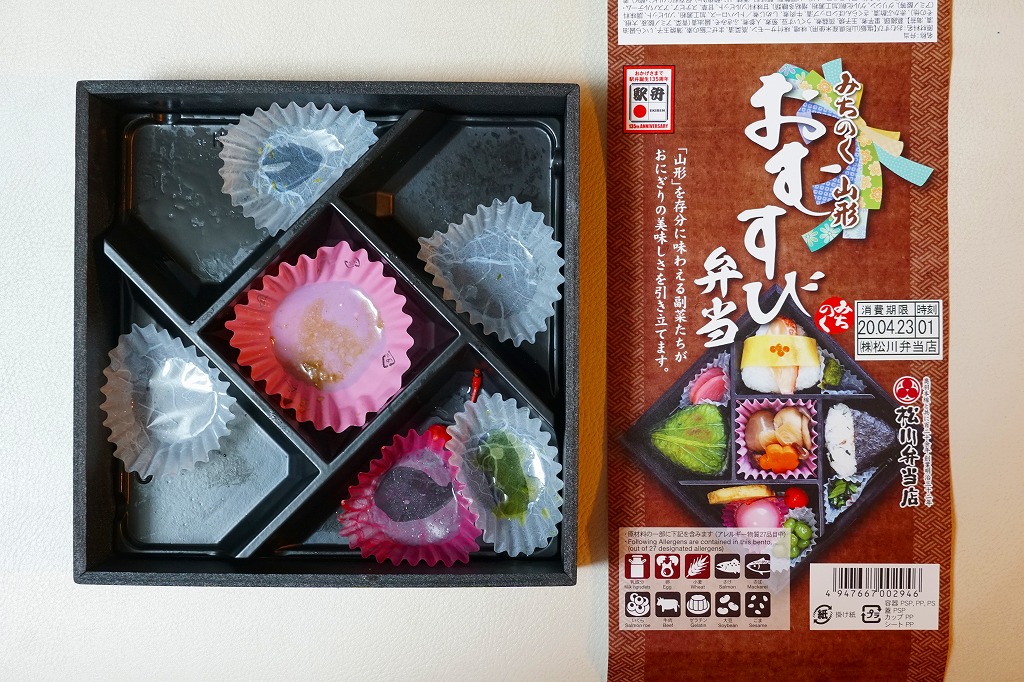 日本鉄道構内営業中央会が駅弁誕生135周年を記念して、会員のうち21社が2020(令和2)年4月10日から販売した、駅弁の原点であるおにぎりをメインとした記念弁当「駅弁誕生135周年おにぎり弁当」の、米沢駅弁の松川弁当店バージョン。
