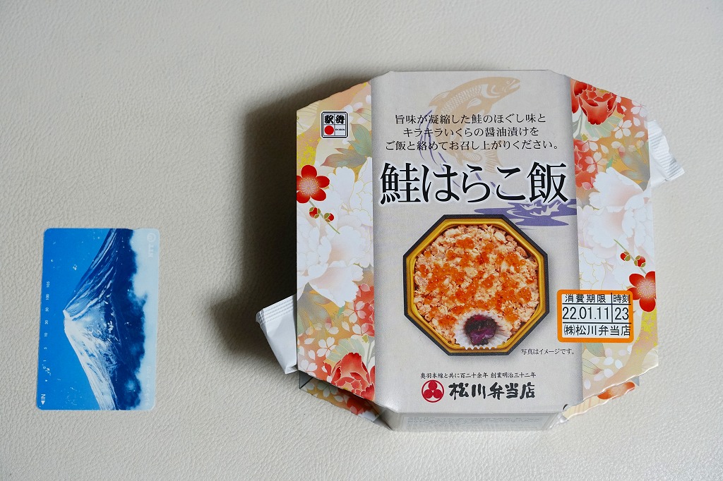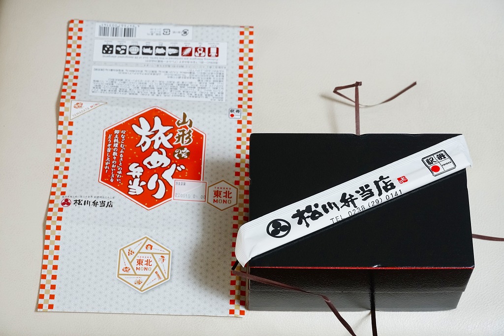 上記の駅弁「山形新幹線つばさ弁当(ニューデザイン)」の、2022年時点での姿。おそらくこの年の8月から、新幹線電車型のプラ容器を、透明プラ箱に入れるのでなく、ボール紙のスリーブに収める姿に替えた。価格はこの年に、1,380円から1,400円に値上げ。旧版の併売も続く。