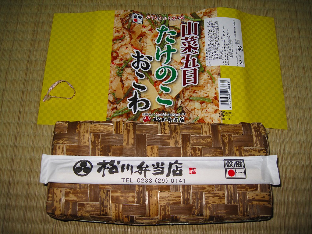 掛紙、容器、中身とも見栄えはとても良いが、中身は竹皮柄のボール紙で底上げされて半分が隙間である。山菜を探さないと見当たらない飯、その飯を青く染めるナス漬、苦みしかないふきみそと、どうしてこうなってしまうのかと思うガッカリ作。御飯そのものはおいしかったことが、せめてもの救いである。米沢駅で普段買えることは無いようだが、NREの東京地区での駅弁大会ではよく見掛けるレギュラー商品。価格は2011年の購入時で950円、2017年時点で春期販売の900円、2021年時点で950円。調製元公式サイトでは2日前までの予約販売旨書いてあった。2022年までの設定か。