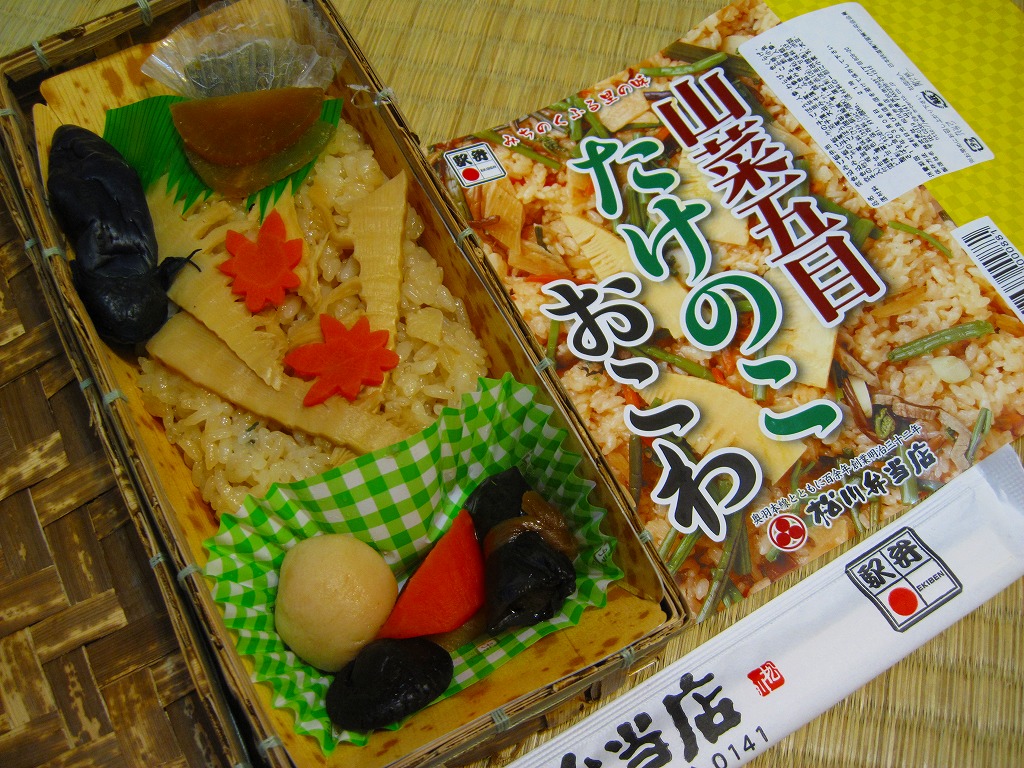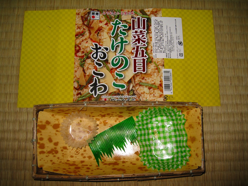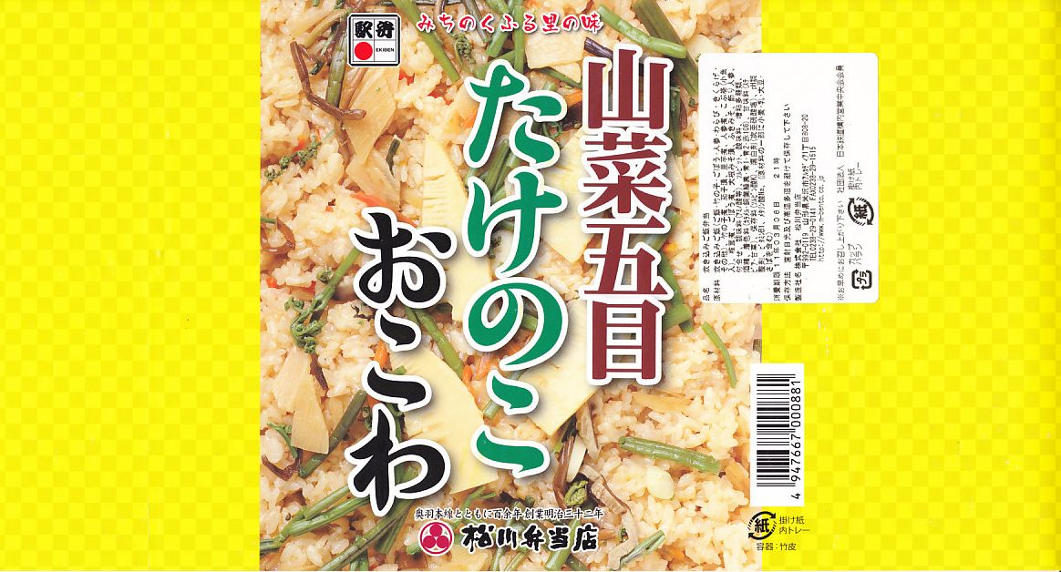 秋冬の駅弁大会シーズンに向けた、2009(平成21)年秋の新商品か。竹皮編みの柔らかく細長い長方形の容器を、中身を示すイメージ写真を商品名とともに印刷した掛紙を巻く。中身は写真と違い山菜がほとんど見えない五目おこわの上にタケノコ煮を載せ、ナス漬、ニンジンやサトイモなどの煮物、ふきみそ、ダイコンの味噌漬を添えるもの。