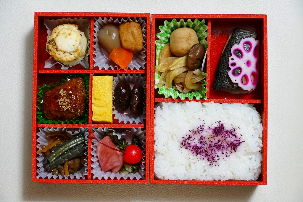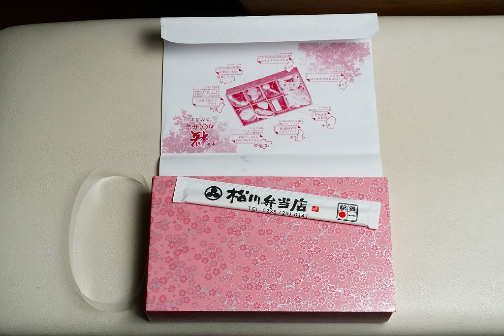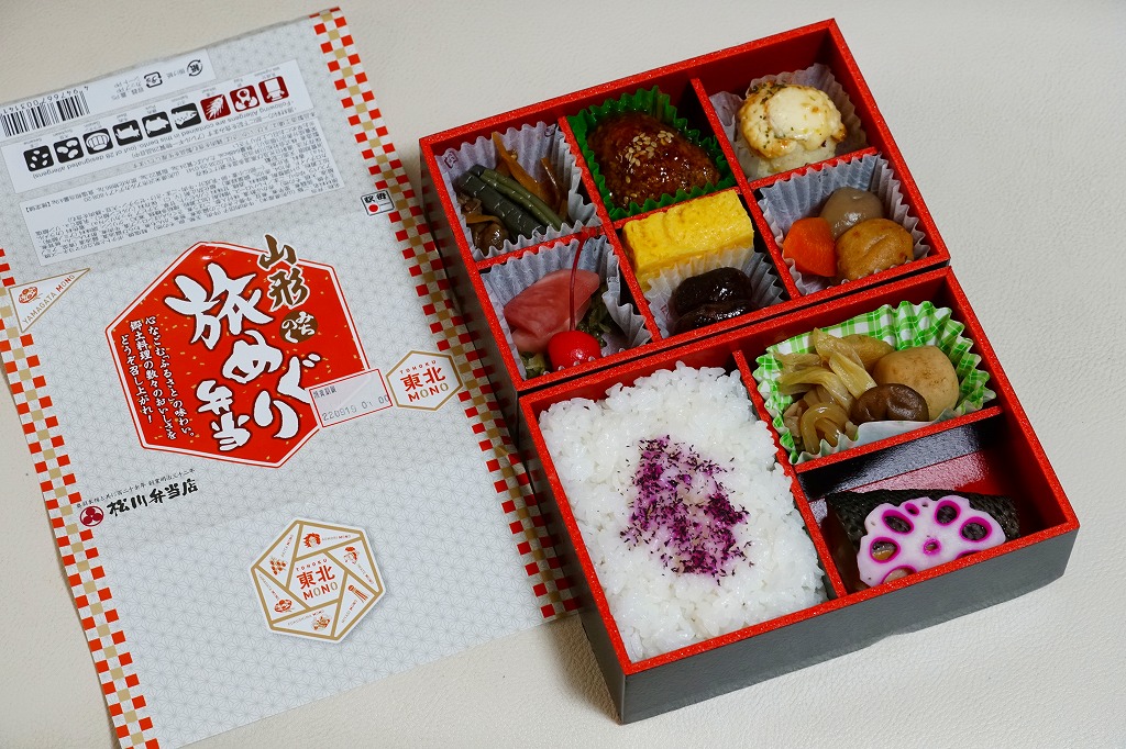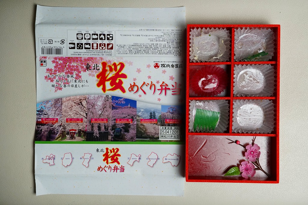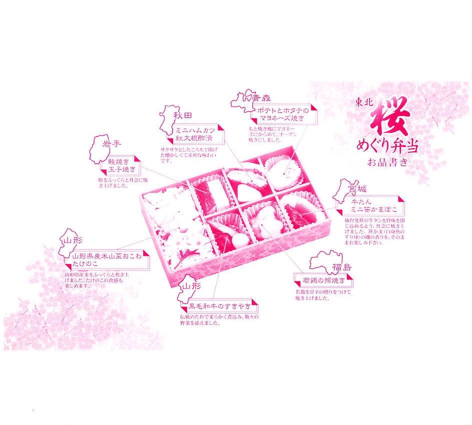 中身はその裏面によると、青森のポテトとホタテのマヨネーズ焼き、岩手の鮭焼きと玉子焼き、宮城の牛たんとミニ笹かまぼこ、秋田のミニハムカツと紅大根酢漬、山形の黒毛和牛のすき焼きと、御飯は山形の山形県産米山菜おこわたけのこ。桜や春というよりはむしろ、例えば「東北福興弁当」に負けないような、東北6県のコンセプトで多種のおかずを詰めるお弁当だった。