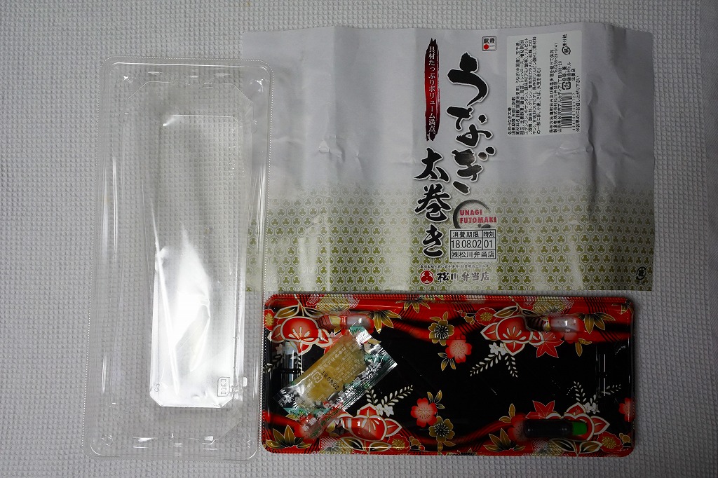 寿司惣菜向けプラ製トレーに、8切れにカットした細身の太巻きを横たえ、透明な上げ蓋をして、商品名を書いた掛紙で巻く。細身の太巻きの具のごく一部がウナギ。最近のウナギ弁当としては比較的廉価でも、味や香りもそれくらい細い感じ。