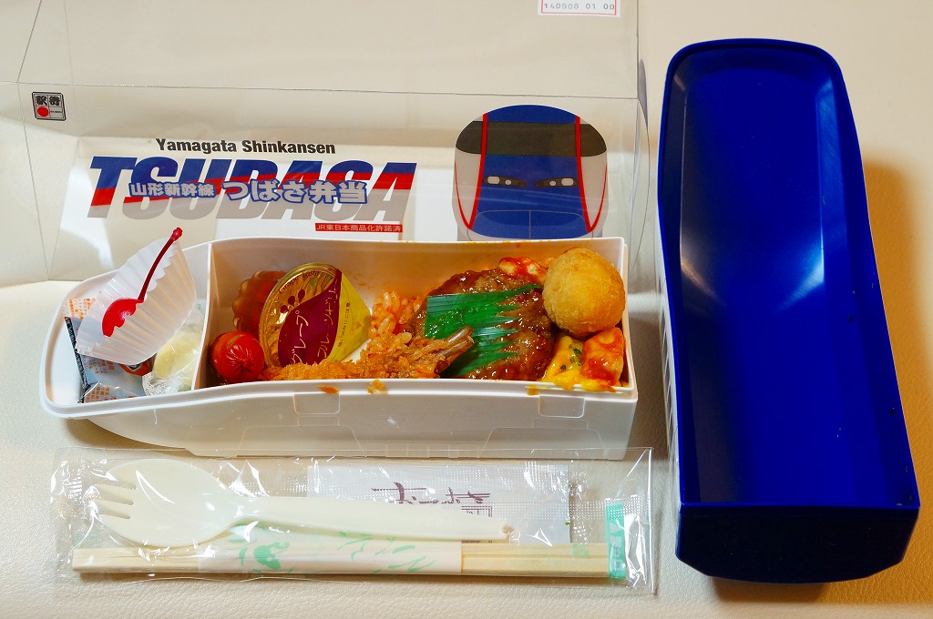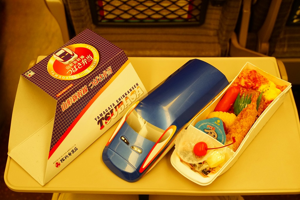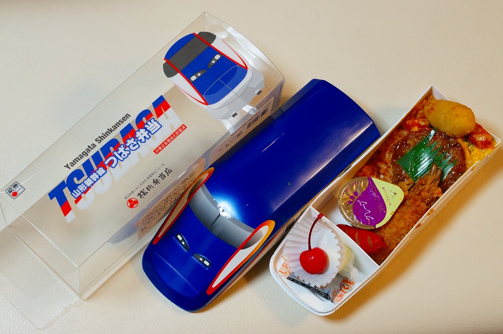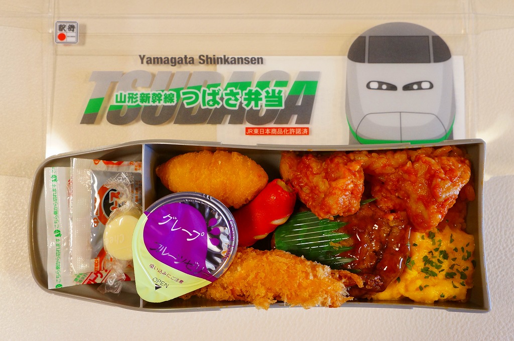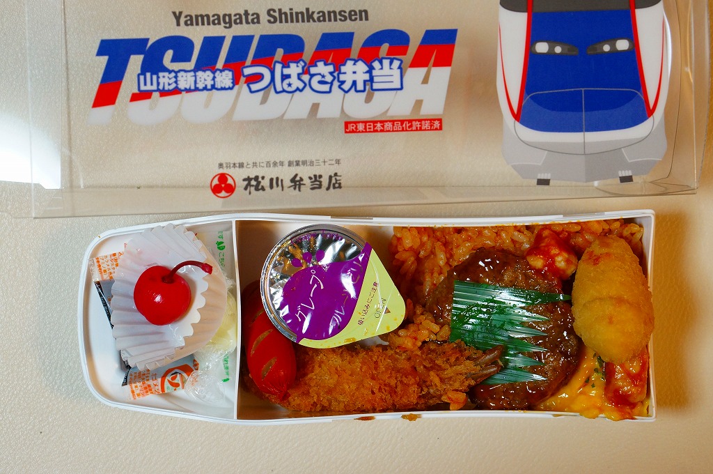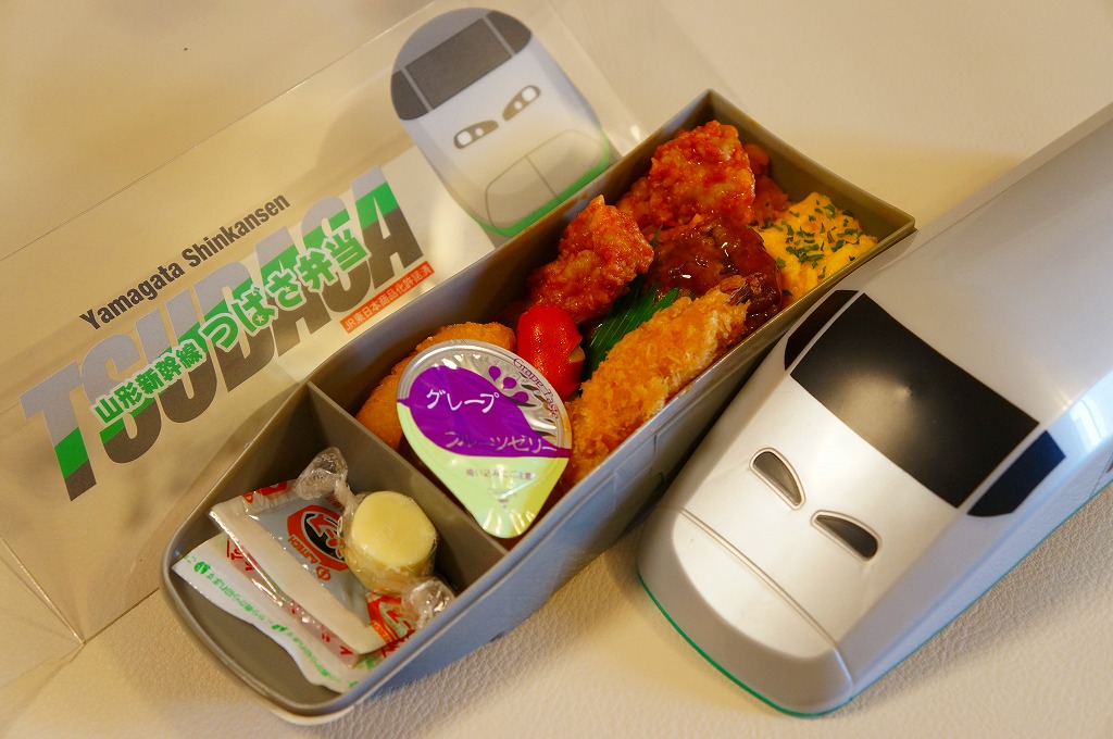 2014(平成26)年の夏までに、下記の駅弁「山形新幹線つばさ弁当」をリニューアル。中身や価格を変えず、実物の車両の塗り替えを反映し、容器の色を変えた。山形新幹線E3系電車の先頭車両を模したプラスティック製の容器にチキンライスを詰め、ハンバーグ、エビフライ、ウインナー、フライドポテト、スクランブルエッグ、鶏唐揚、チーズ、ぶどうゼリーなどを詰める。