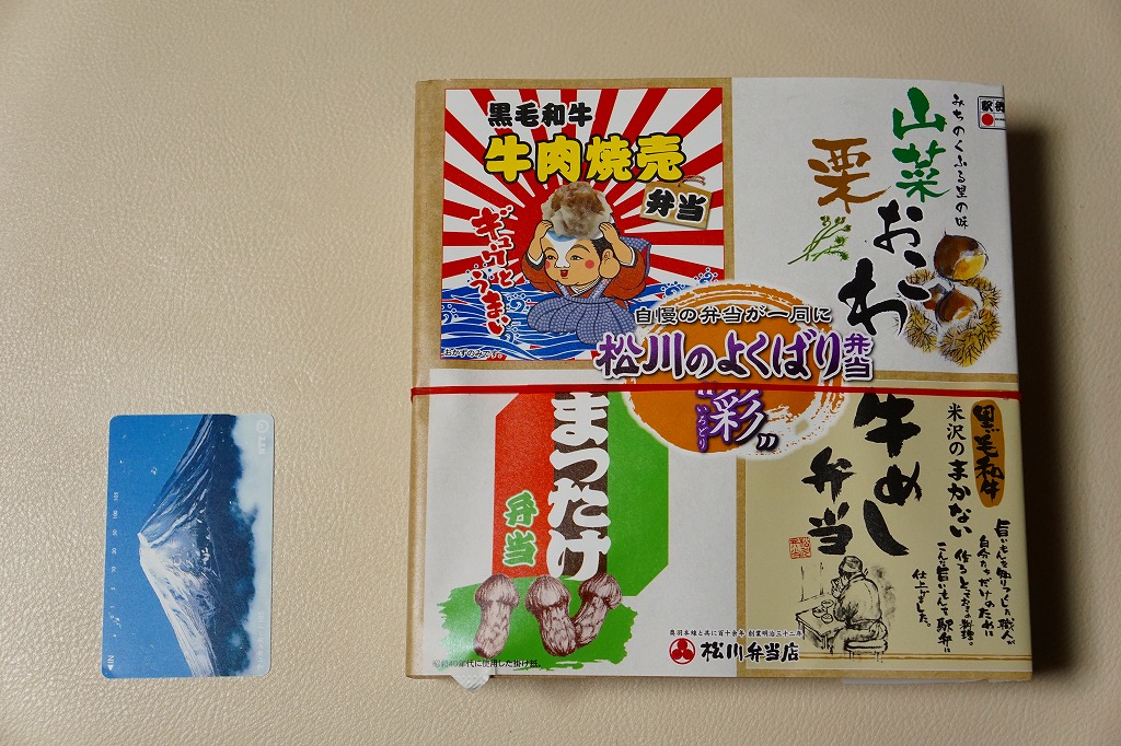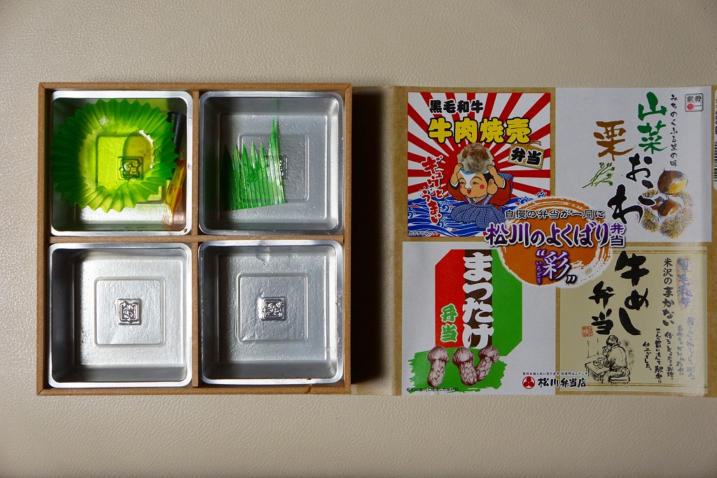 2016(平成28)年の11月から翌年2月までの販売か。当時に各地の駅弁屋の名前で登場していた、既存の4駅弁の組合せ商品の、米沢駅の松川弁当店バージョン。ここでは「華」と「彩」の2種類が出た。この「彩」は同社の駅弁「黒毛和牛牛肉焼売弁当」「山菜栗おこわ」「米沢のまかない牛めし弁当」「まつたけ弁当」の詰合せで、実物を思い当たらないまつたけ弁当を除き、それぞれの駅弁の中身の特徴が取り入れられた。「黒毛和牛牛肉焼売弁当」以外はすべて飯を詰めているので、分量は多めに感じる。2021年時点で季節限定かつ要予約の商品として、公式サイトに掲載されていたが、2022年には消えていた。