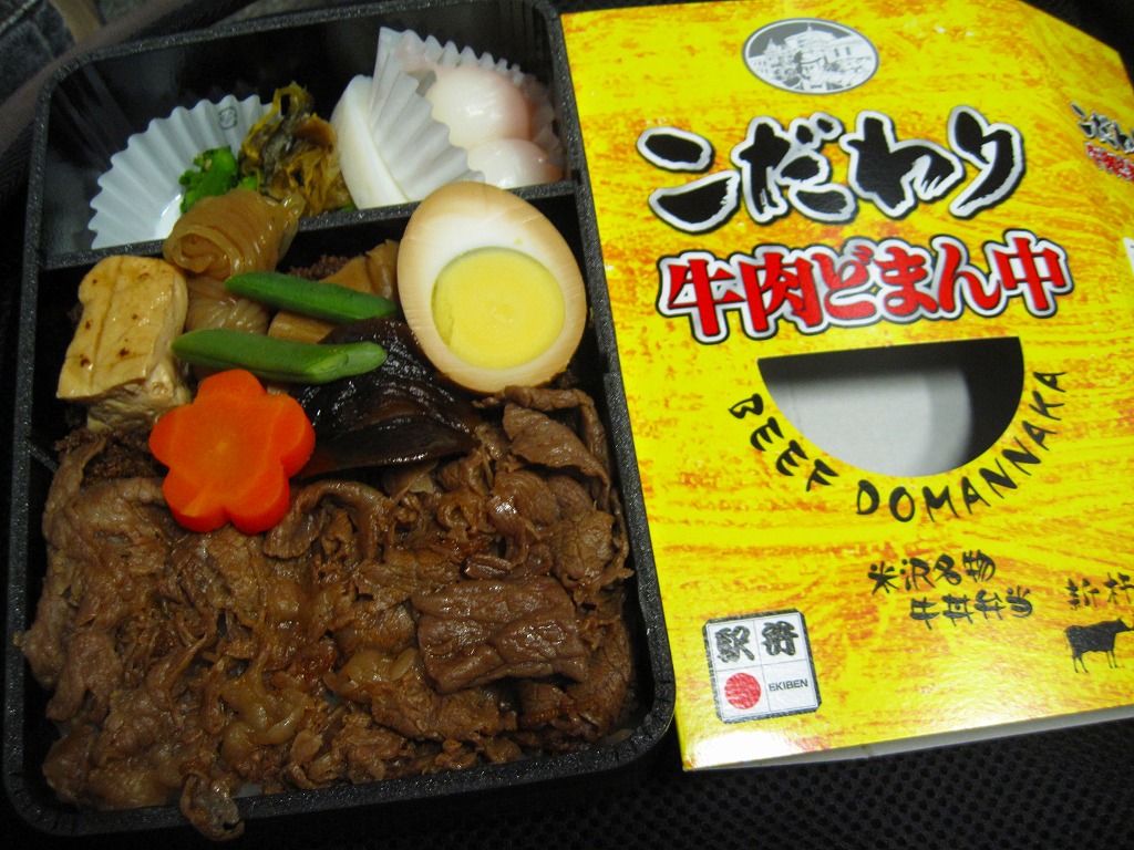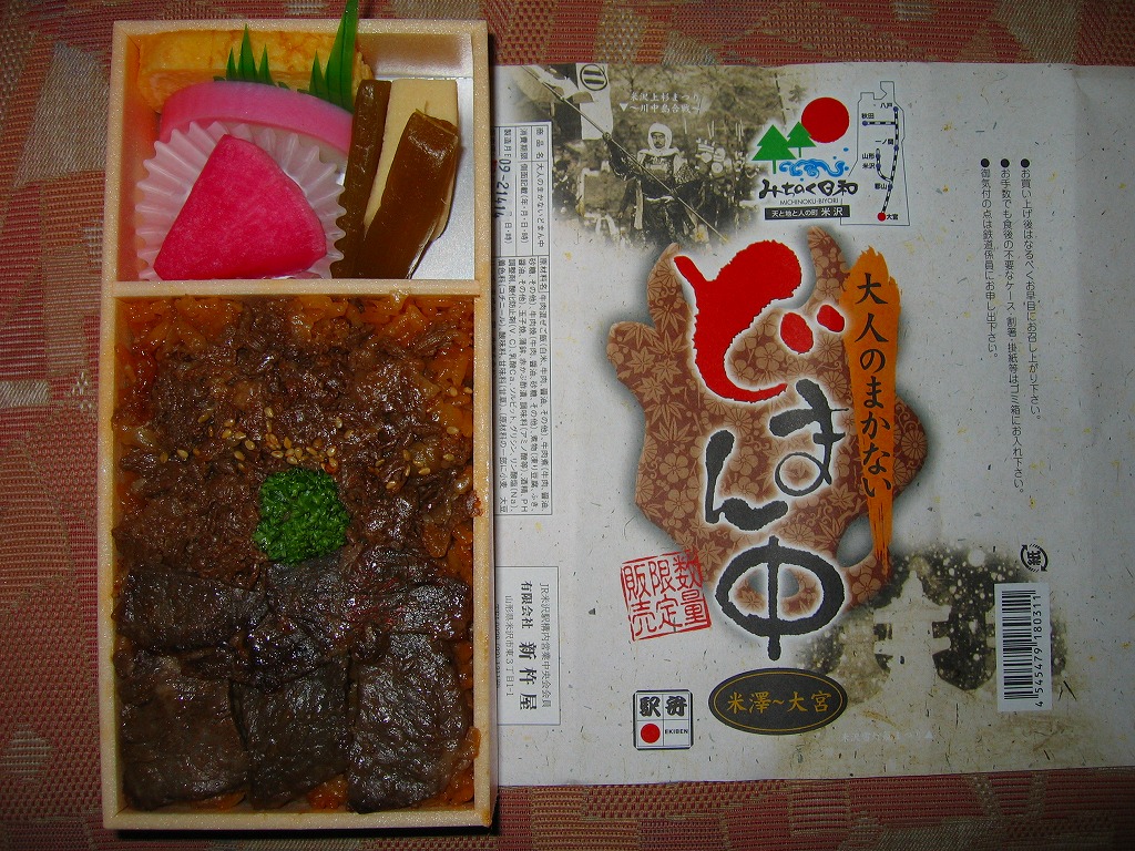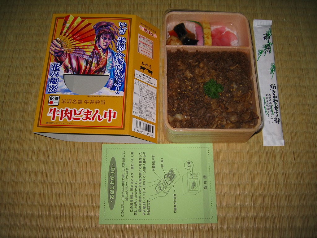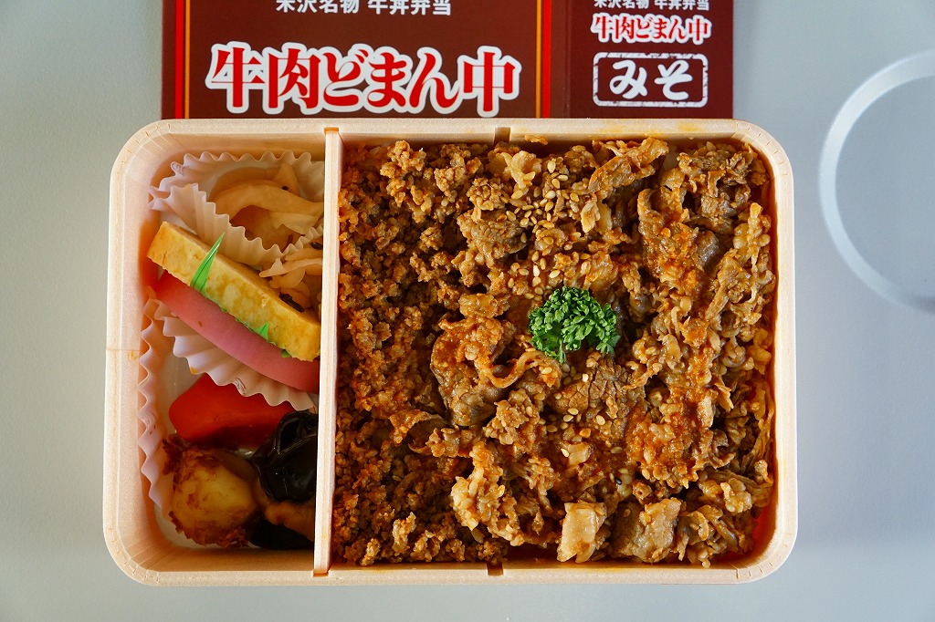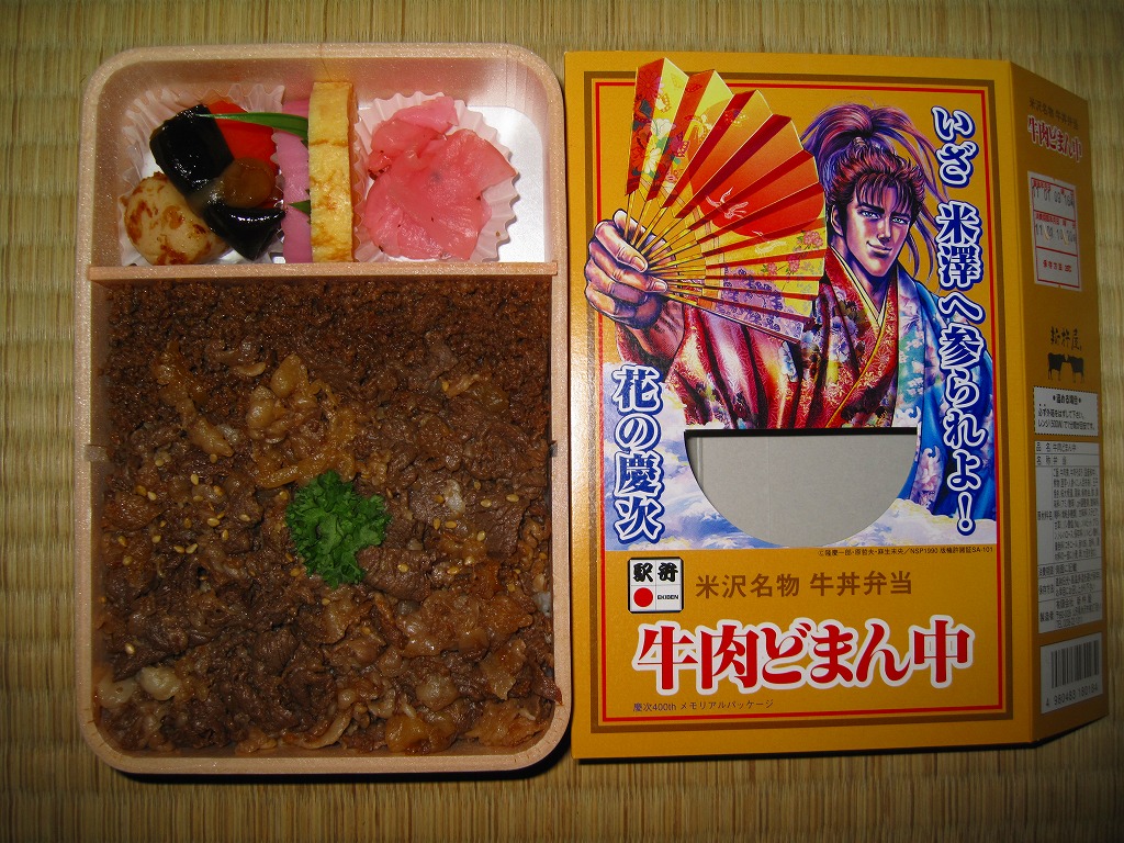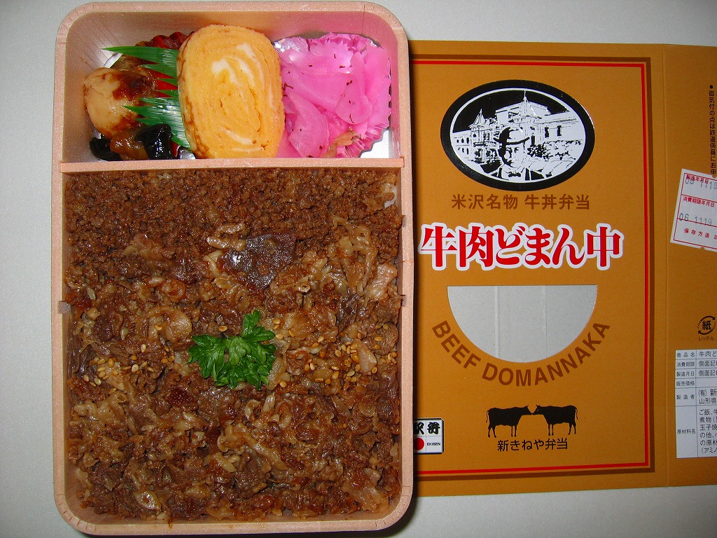 1993(平成5)年の発売。山形新幹線開業記念駅弁と紹介する資料が多いが、1992(平成4)年7月の開業とは1年のずれがある。米沢と日本を代表する、有名で名物の駅弁。1992年に公募で名前が付けられた山形生まれのお米「どまんなか」の白御飯を、米沢の名物である牛肉にちなみ、甘辛な牛肉煮と牛そぼろで覆い、サトイモ、ニンジン、ニシン昆布巻、かまぼこ、玉子焼、大根桜漬を添える。米沢の名物と山形の米を、デザインでも内容でもシンプルに組み合わせた。