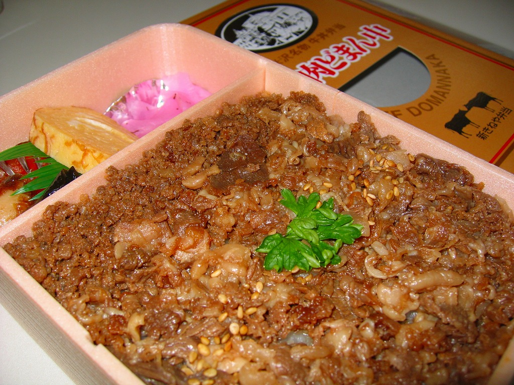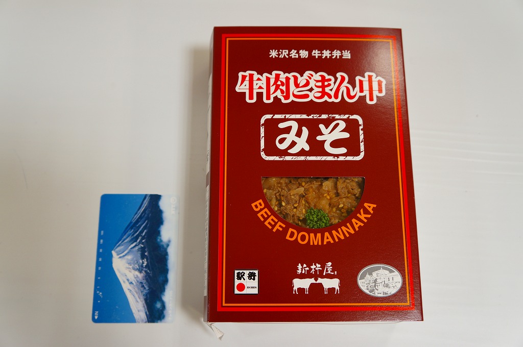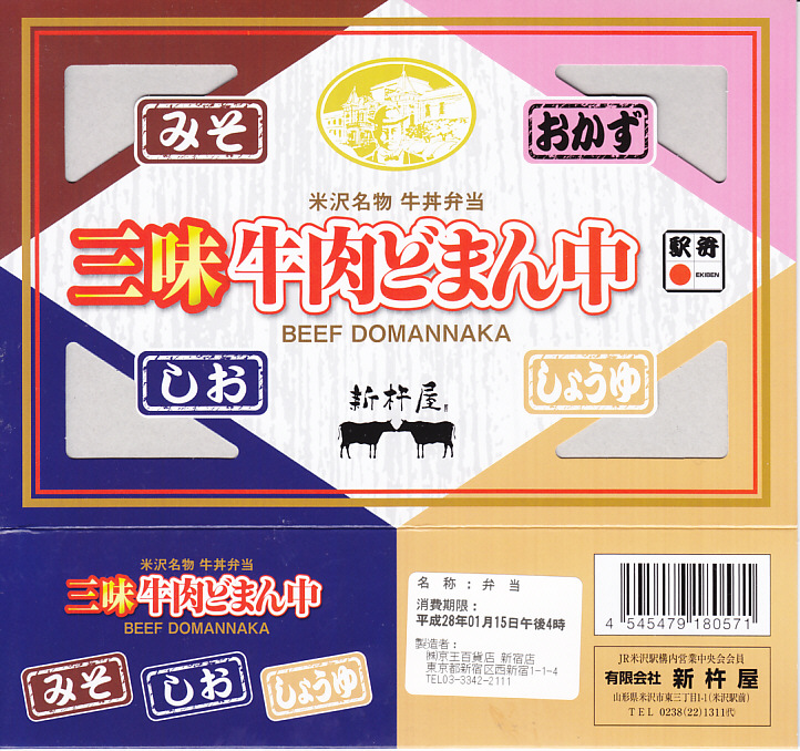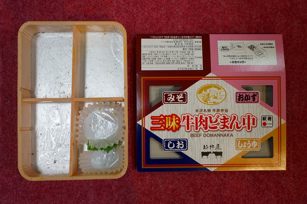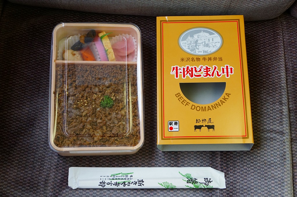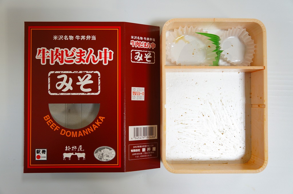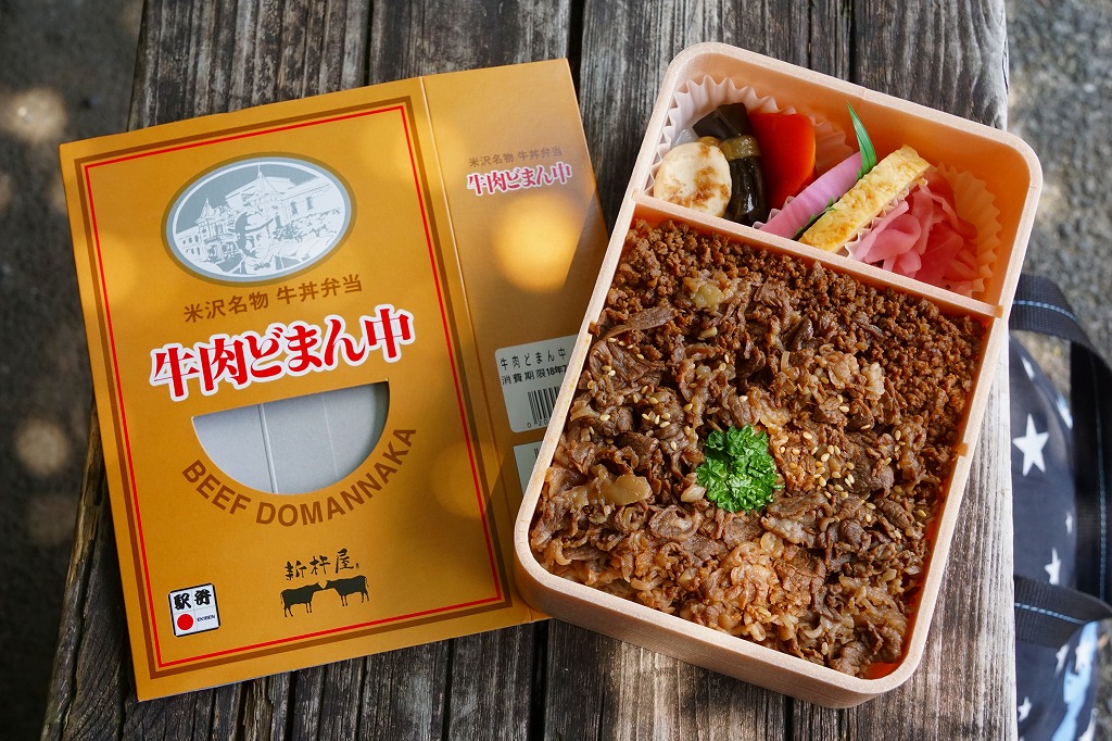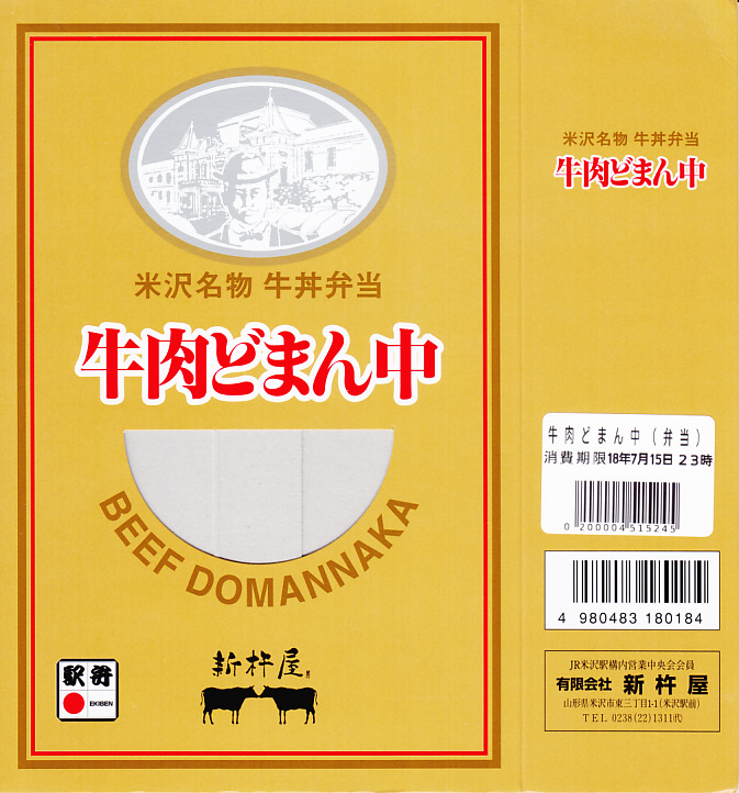 1993(平成5)年の発売。山形新幹線開業記念駅弁と紹介する資料が多いが、1992(平成4)年7月の開業とは1年のずれがある。米沢と日本を代表する、有名で名物の駅弁。1992年に公募で名前が付けられた山形生まれのお米「どまんなか」の白御飯を、米沢の名物である牛肉にちなみ、甘辛な牛肉煮と牛そぼろで覆い、サトイモ、ニンジン、ニシン昆布巻、かまぼこ、玉子焼、大根桜漬を添える。米沢の名物と山形の米を、デザインでも内容でもシンプルに組み合わせた。