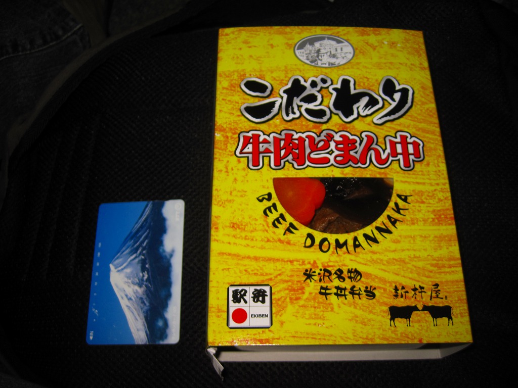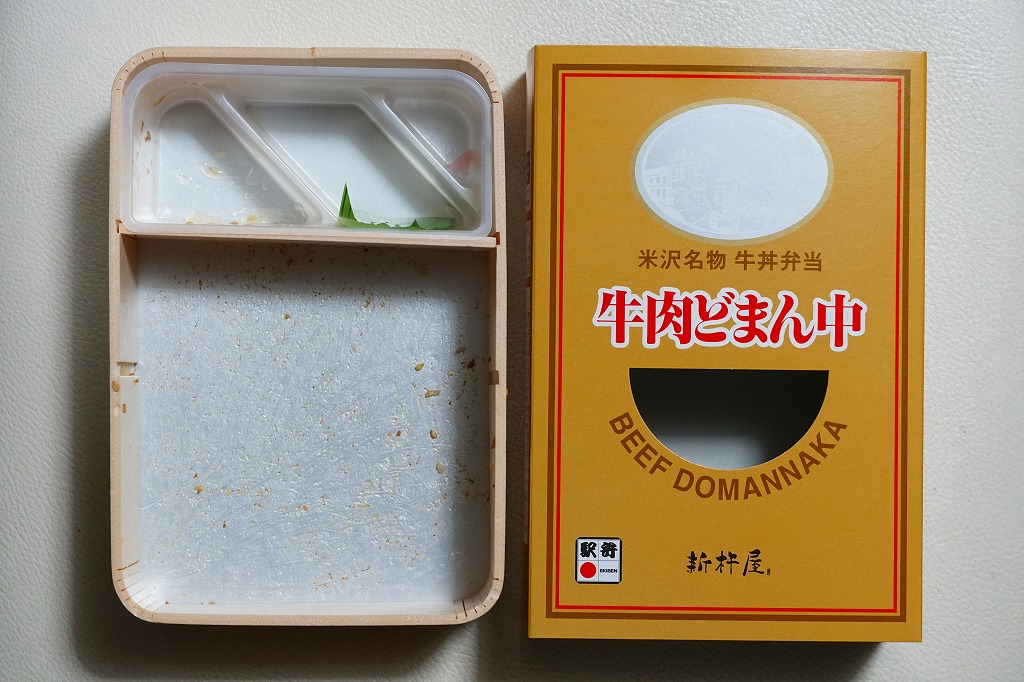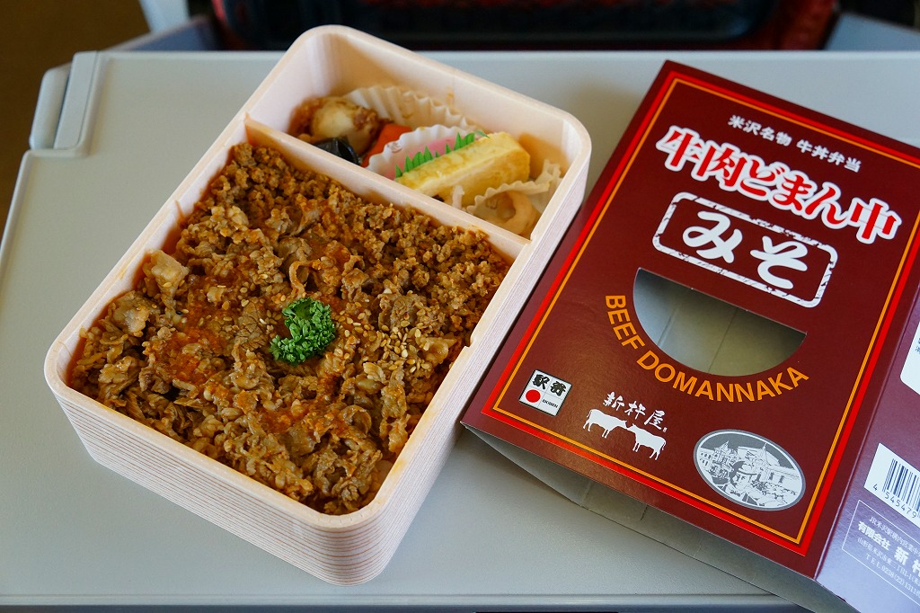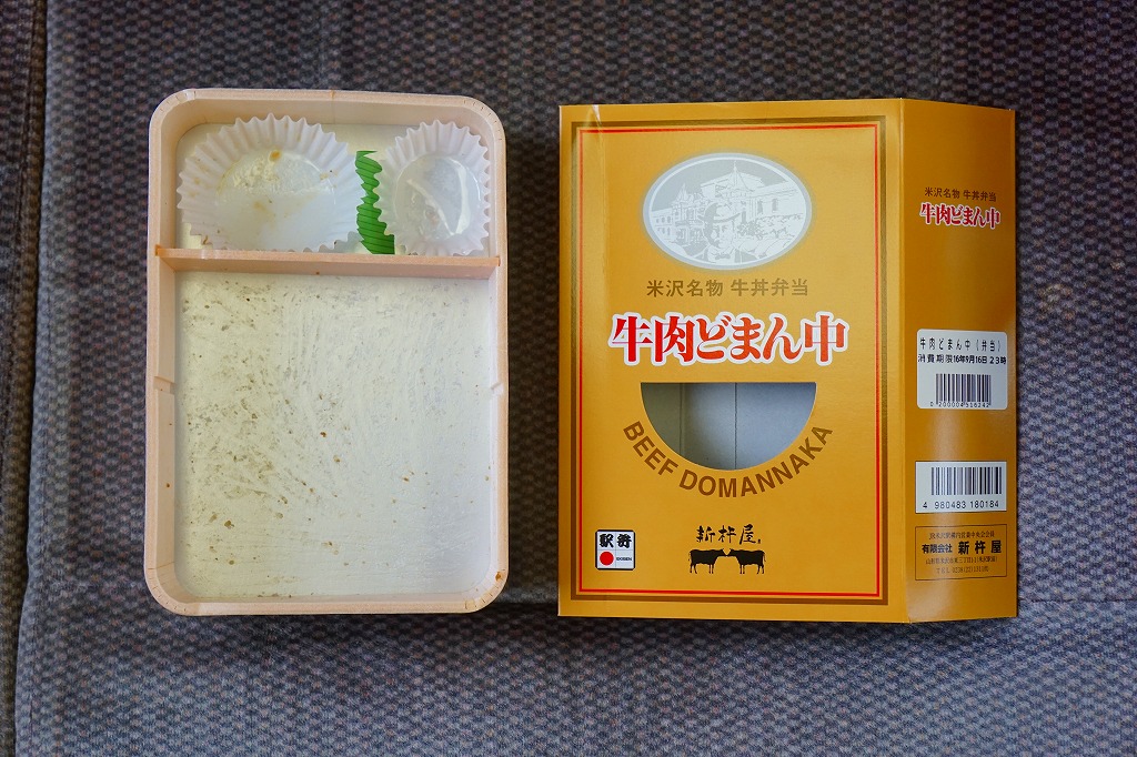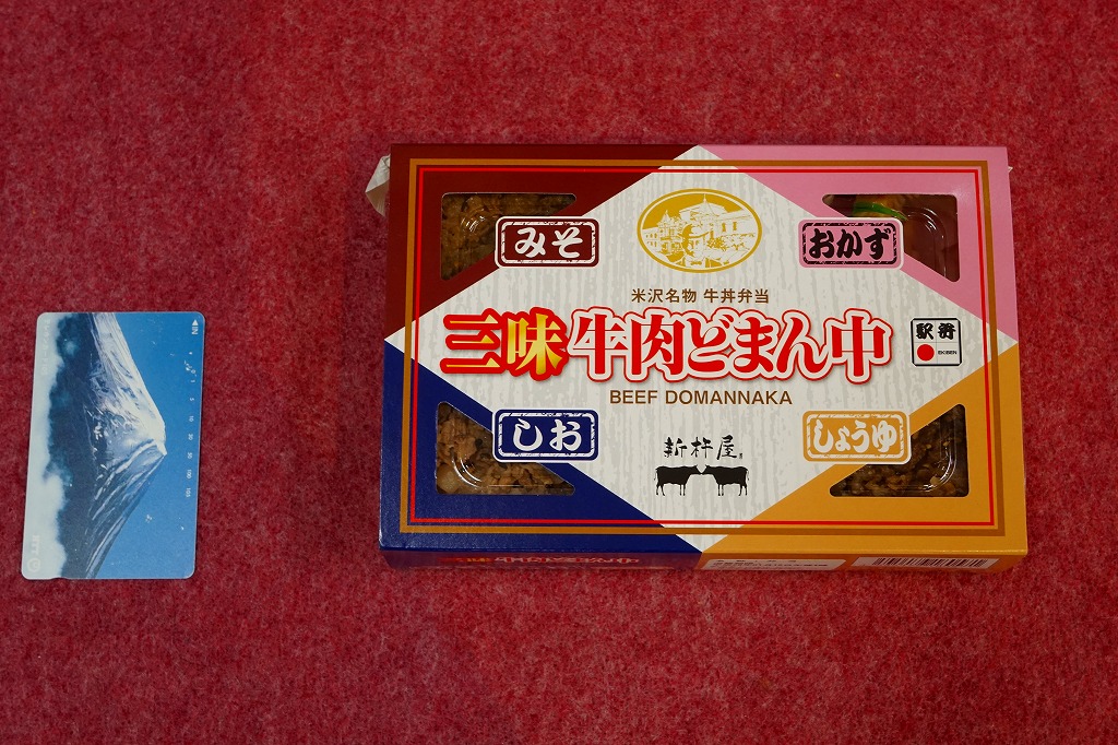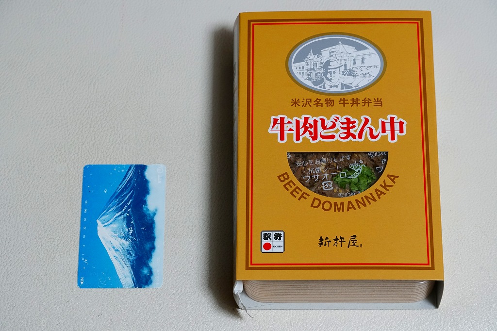 1993(平成5)年の発売。山形新幹線開業記念駅弁と紹介する資料が多いが、1992(平成4)年7月の開業とは1年のずれがある。米沢と日本を代表する、有名で名物の駅弁。1992年に公募で名前が付けられた山形生まれのお米「どまんなか」の白御飯を、米沢の名物である牛肉にちなみ、甘辛な牛肉煮と牛そぼろで覆い、サトイモ、ニンジン、ニシン昆布巻、かまぼこ、玉子焼、大根桜漬を添える。米沢の名物と山形の米を、デザインでも内容でもシンプルに組み合わせた。