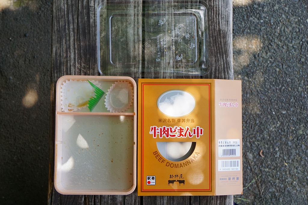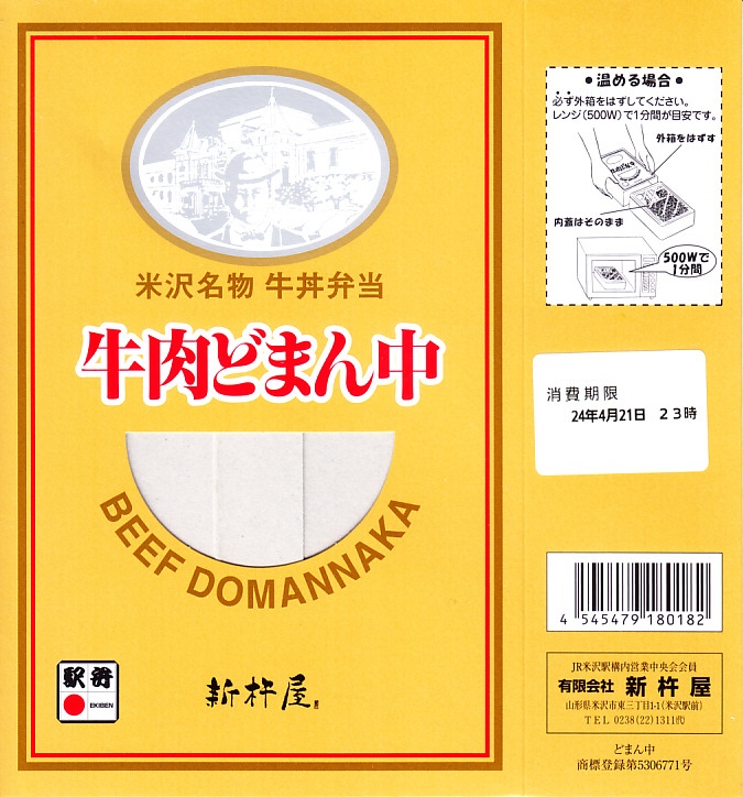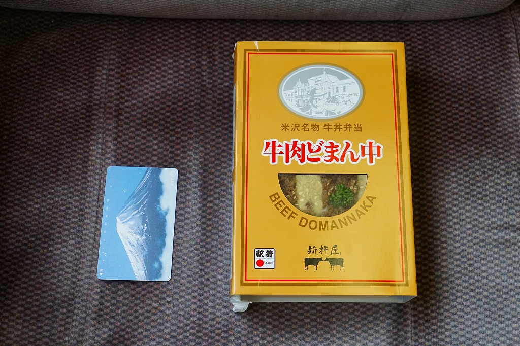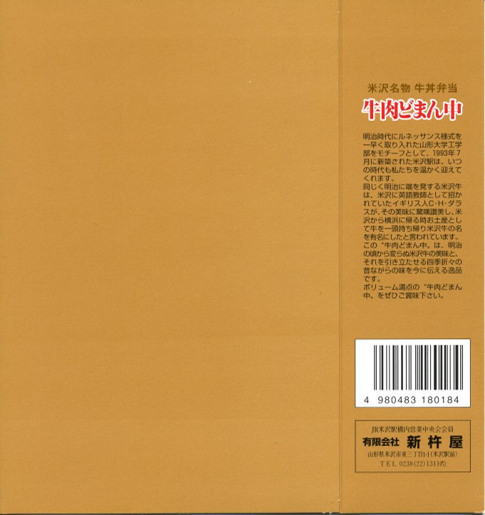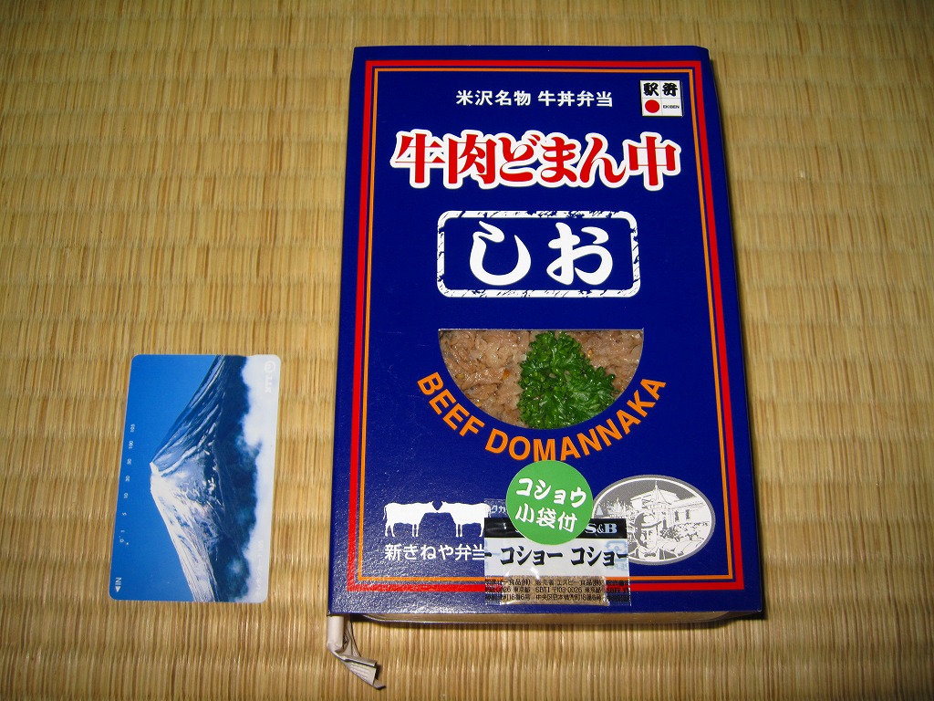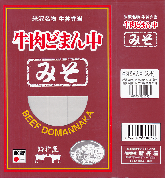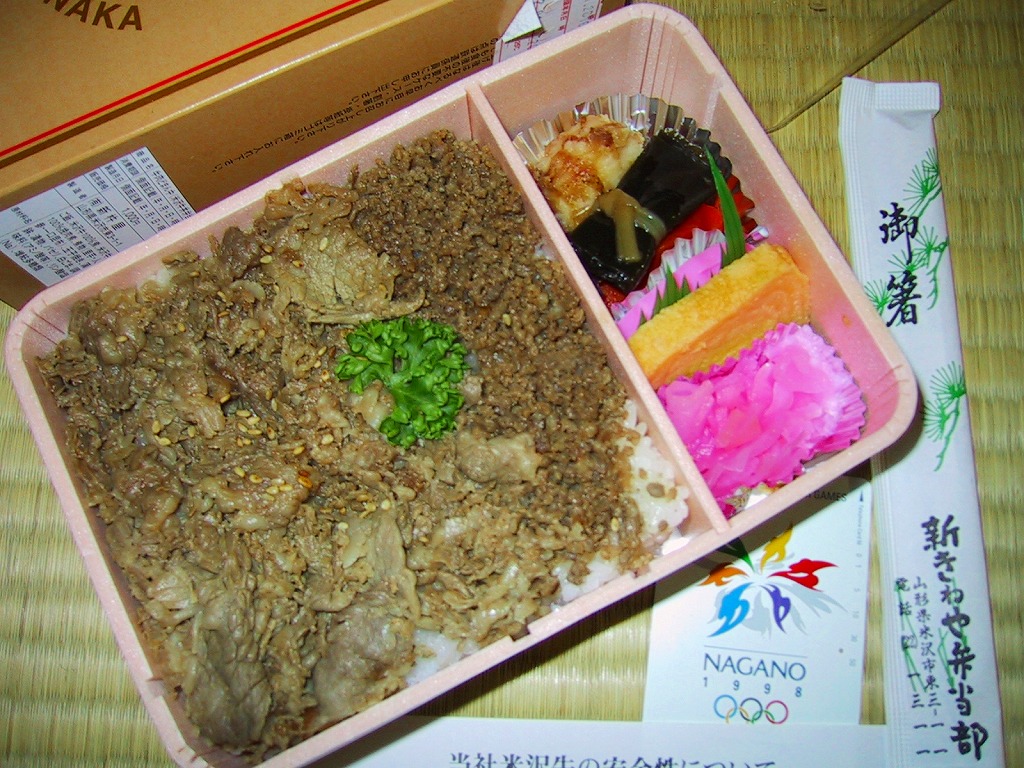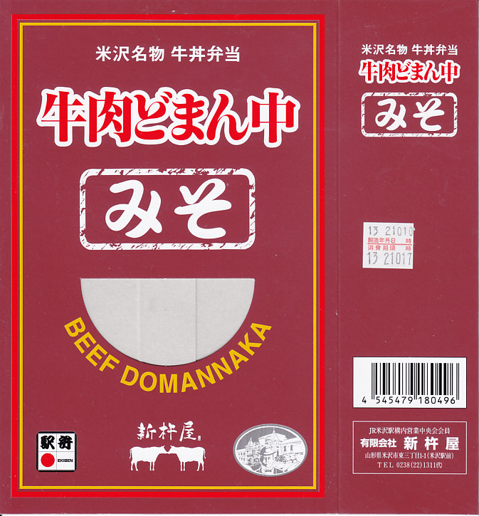 1993(平成5)年の発売。山形新幹線開業記念駅弁と紹介する資料が多いが、1992(平成4)年7月の開業とは1年のずれがある。米沢と日本を代表する、有名で名物の駅弁。1992年に公募で名前が付けられた山形生まれのお米「どまんなか」の白御飯を、米沢の名物である牛肉にちなみ、甘辛な牛肉煮と牛そぼろで覆い、サトイモ、ニンジン、ニシン昆布巻、かまぼこ、玉子焼、大根桜漬を添える。米沢の名物と山形の米を、デザインでも内容でもシンプルに組み合わせた。