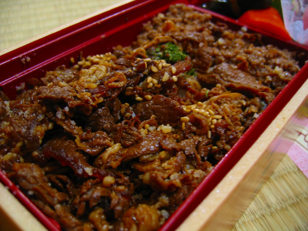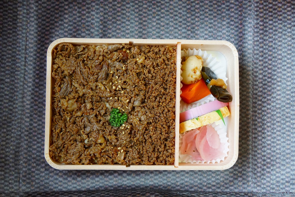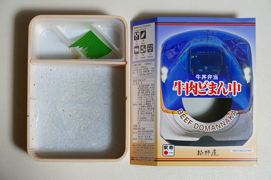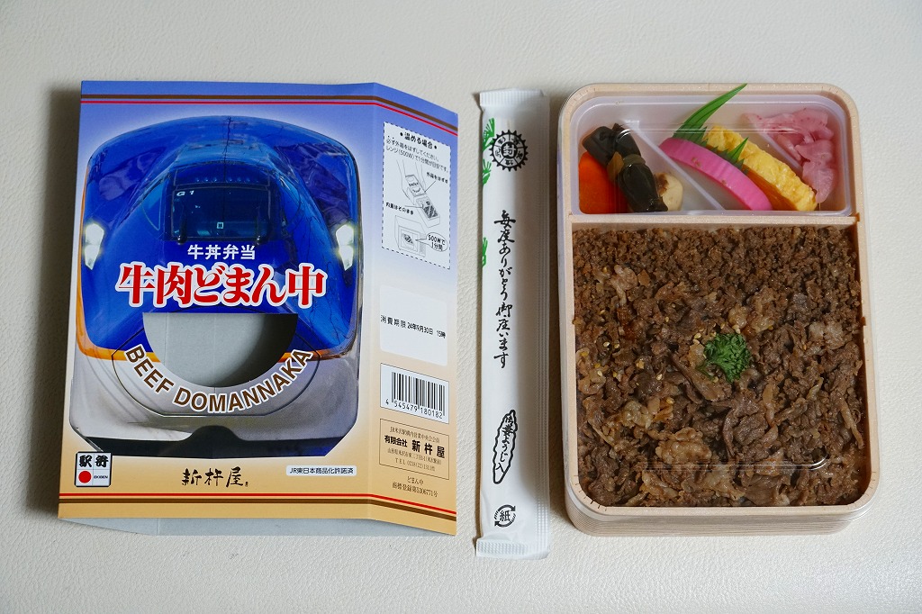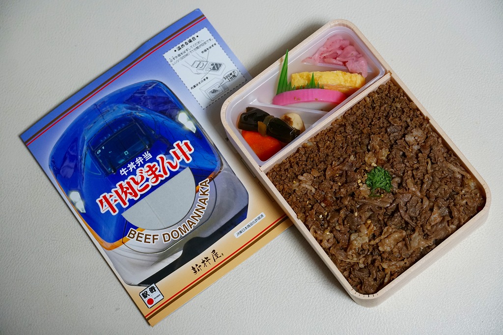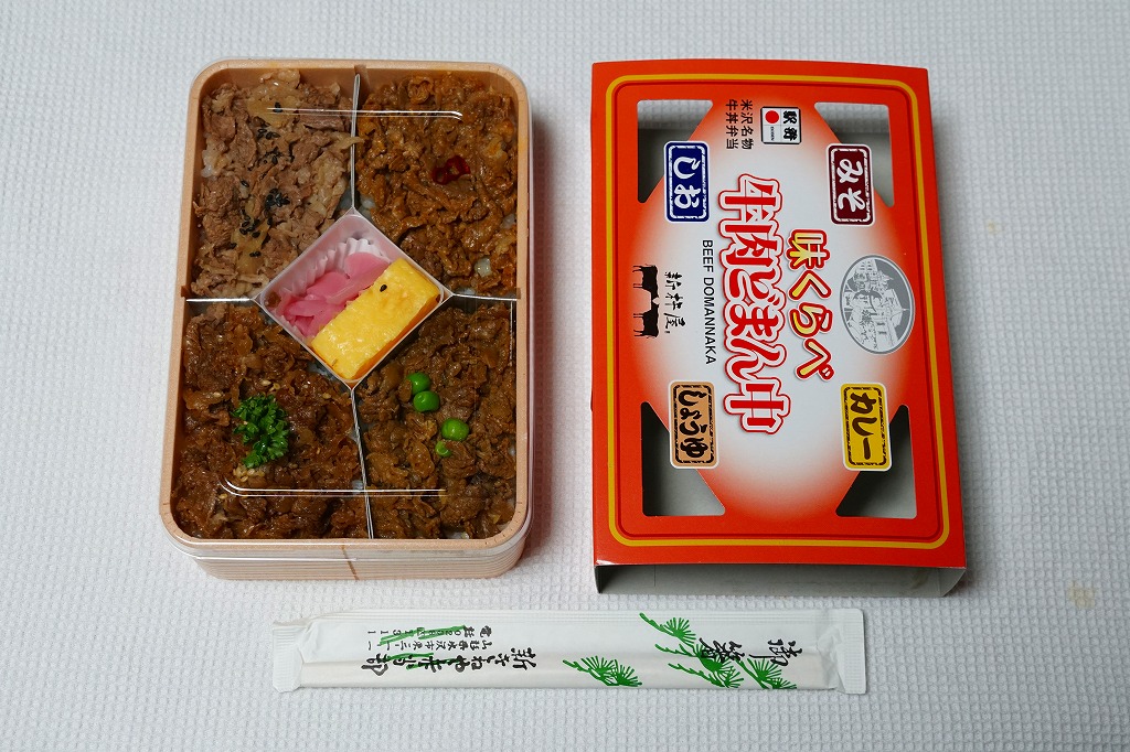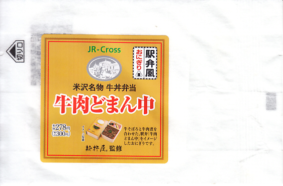 中身は牛肉の混ぜ御飯と上を半分ずつ、牛すき焼き肉と牛焼肉で埋め、玉子焼、かまぼこ、赤カブ酢漬などを添えるもの。名前のとおり、有名駅弁「牛肉どまん中」の姉妹品だろう。容器と肉と飯に差異があるので、雰囲気はそこそこ異なる。分量を抑えて千円を切った価格にも好印象。後に米沢駅でも売られたらしい。2010年頃までの販売か。