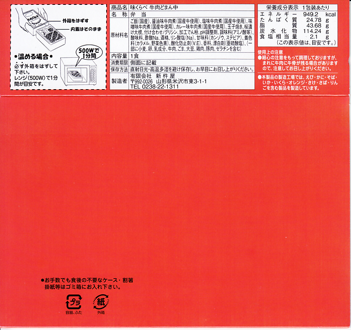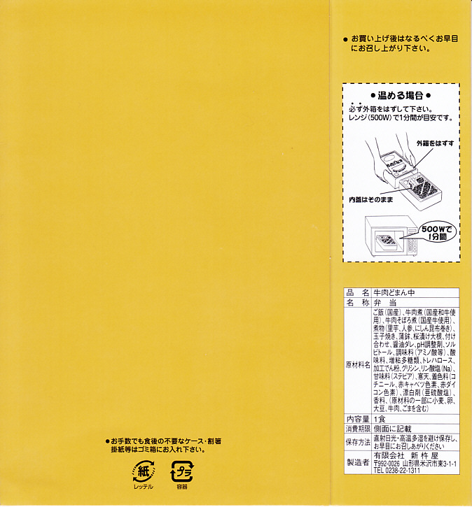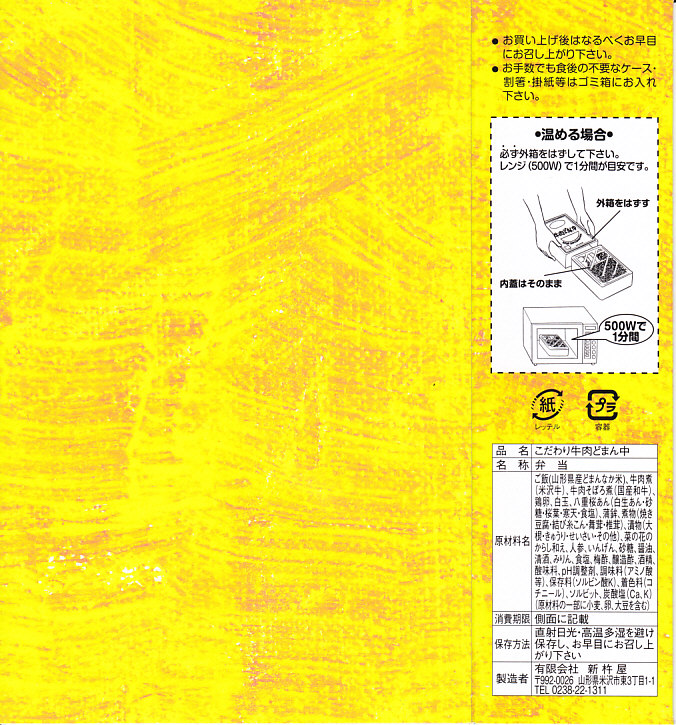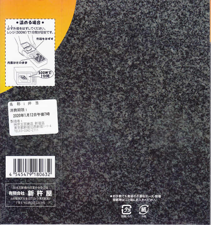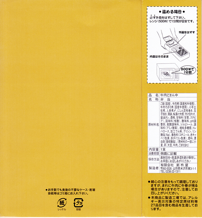 2016(平成28)年9月16日に購入した、米沢駅弁のスリーブ。上記の2018年のものと同じにみえて、容器側面の注意書きが少し違う。