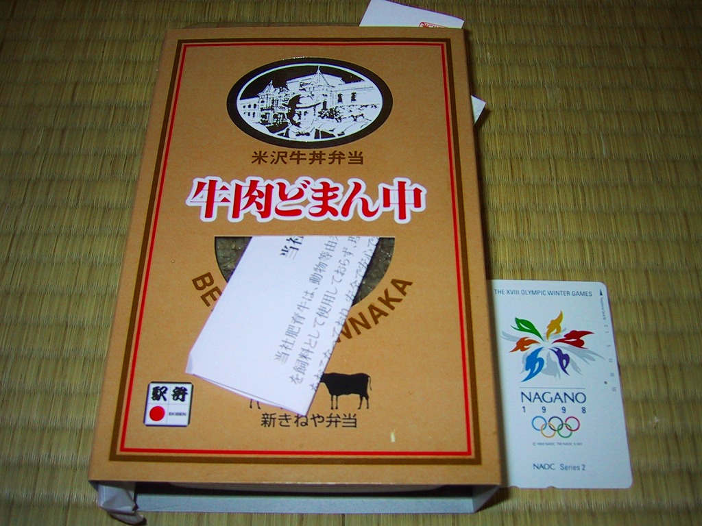 2002(平成14)年1月26日の調製である、米沢駅弁のパッケージ。4年後との差異は、タイトルが「米沢牛丼弁当」か「米沢名物 牛丼弁当」かの違いのみか。