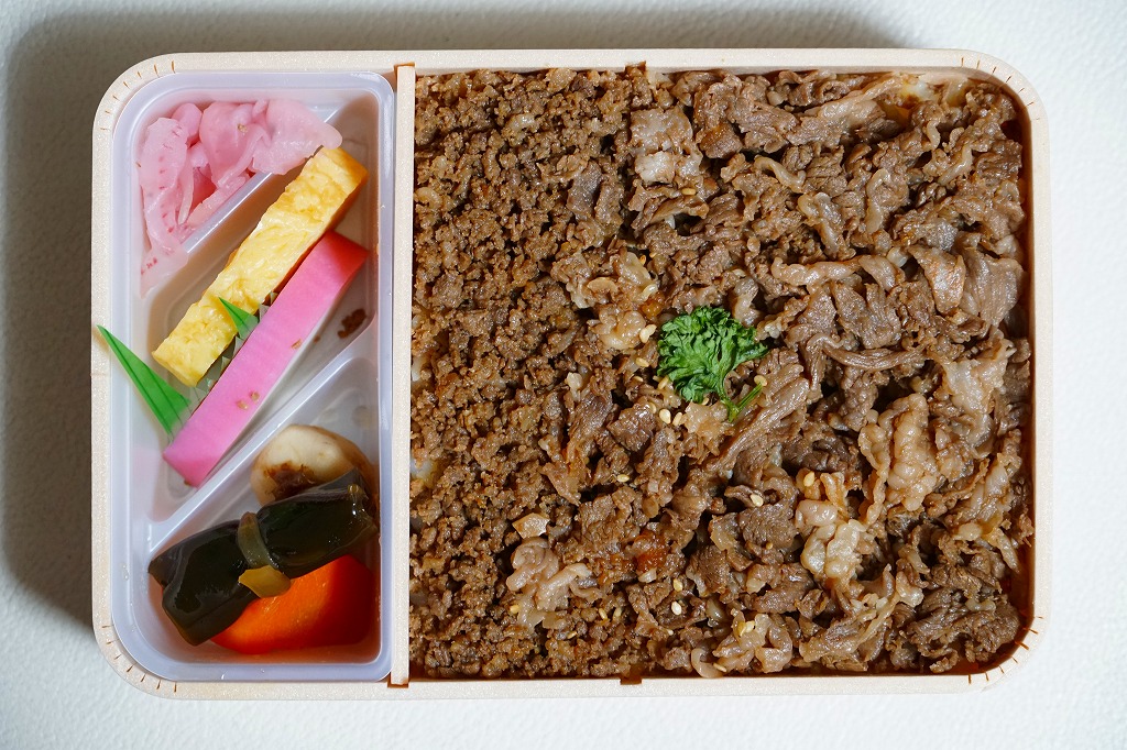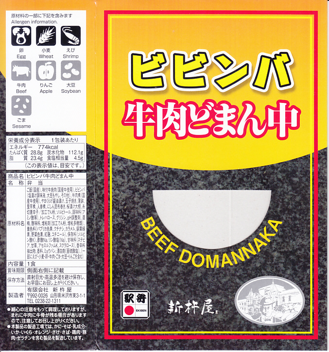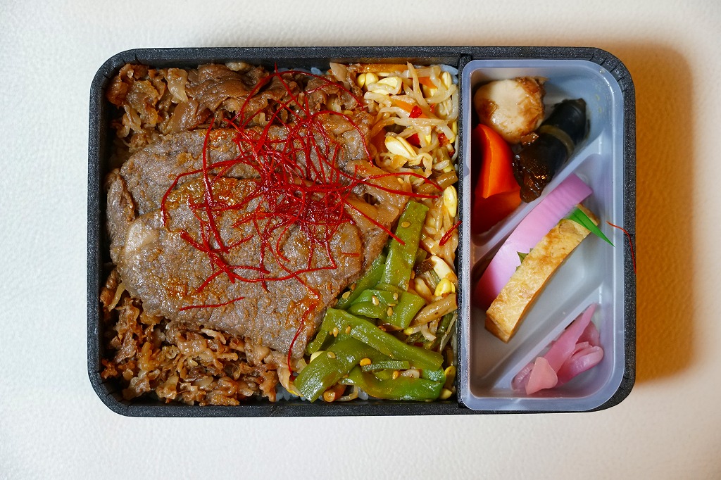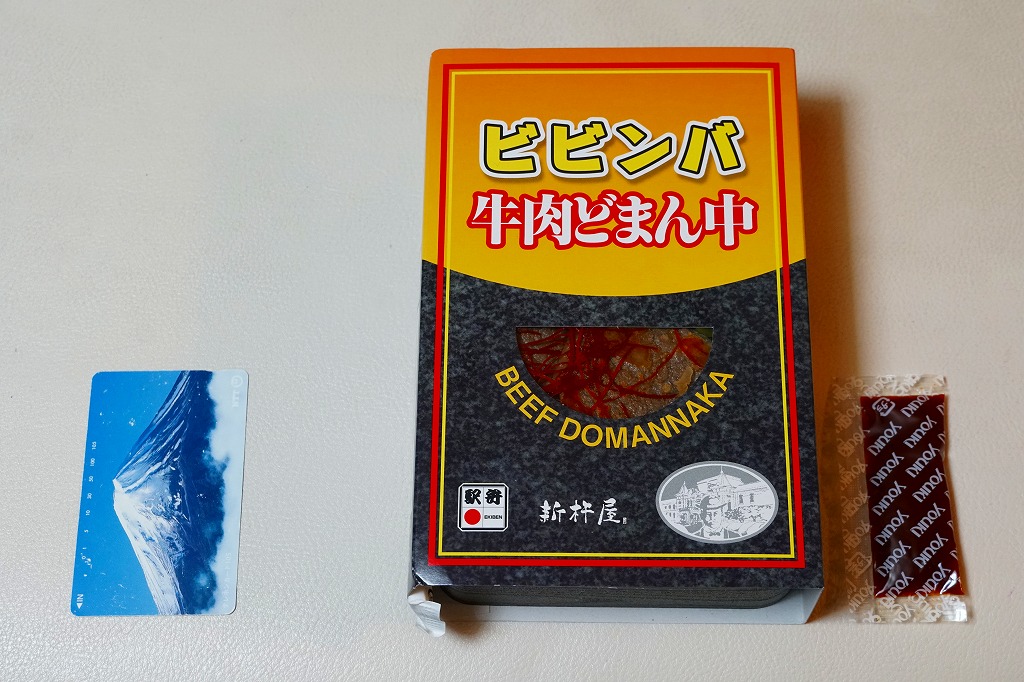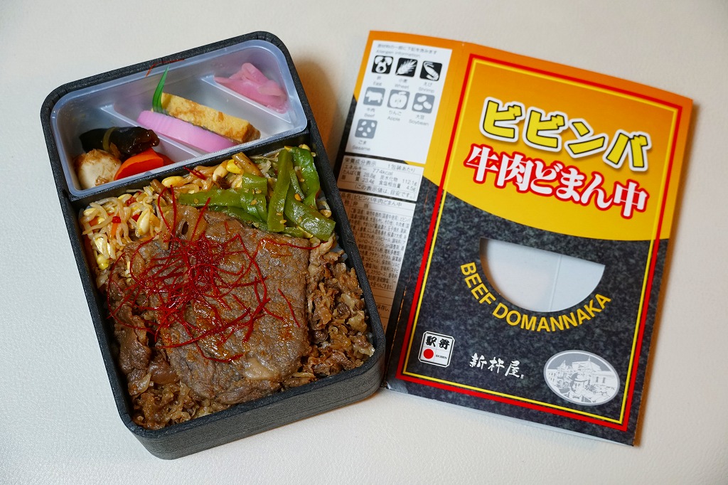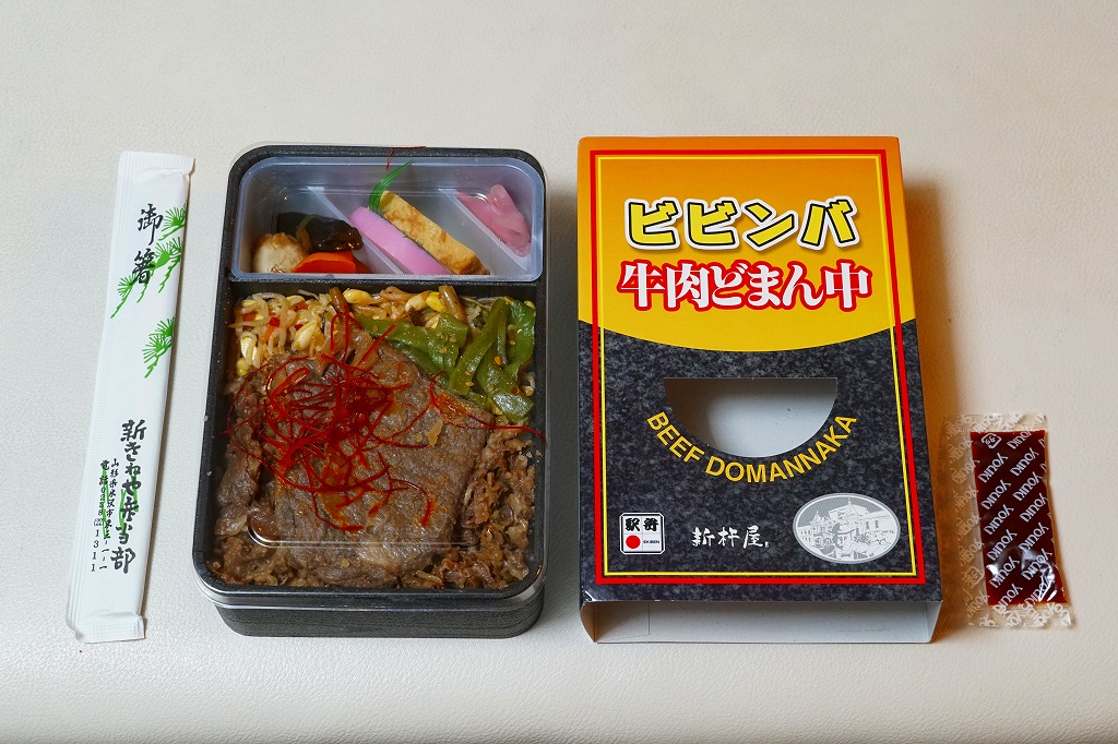 2020(令和2)年1月の京王百貨店の駅弁大会で実演販売。米沢と日本を代表する駅弁「牛肉どまん中」について、具をビビンバに替えたもの。白飯を牛肉煮と牛焼肉とナムルで覆い、付合せは普段と同じ煮物とかまぼこと玉子焼と漬物とし、コチジャンを別添する。甘みも辛さも固さもほどほどの、無難にうまい牛焼肉弁当だった。2021年で終売か。