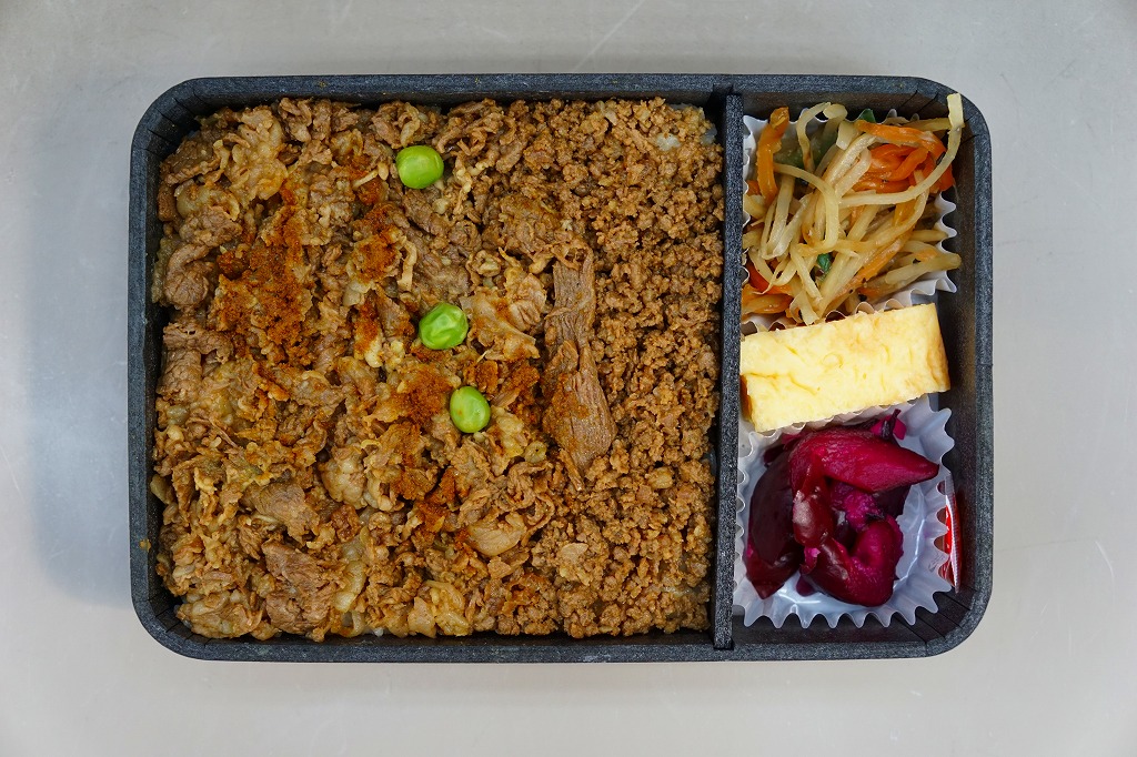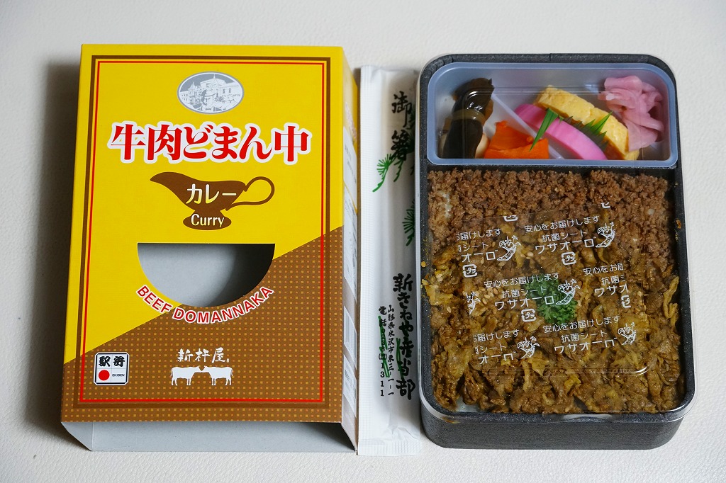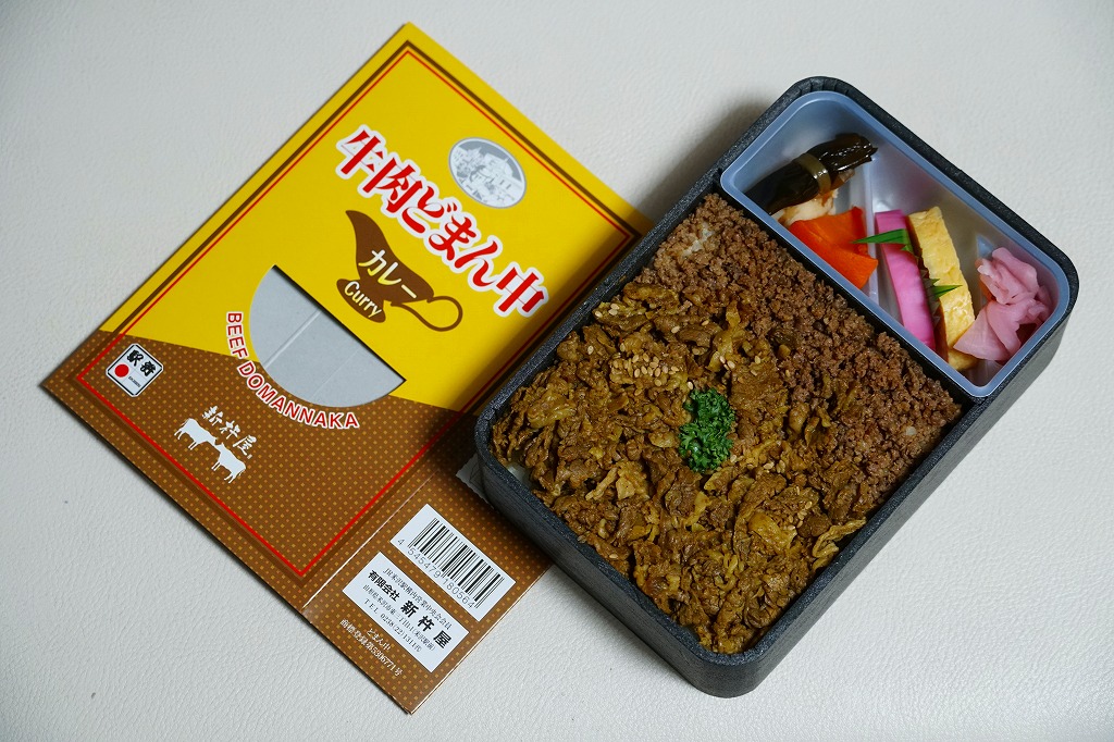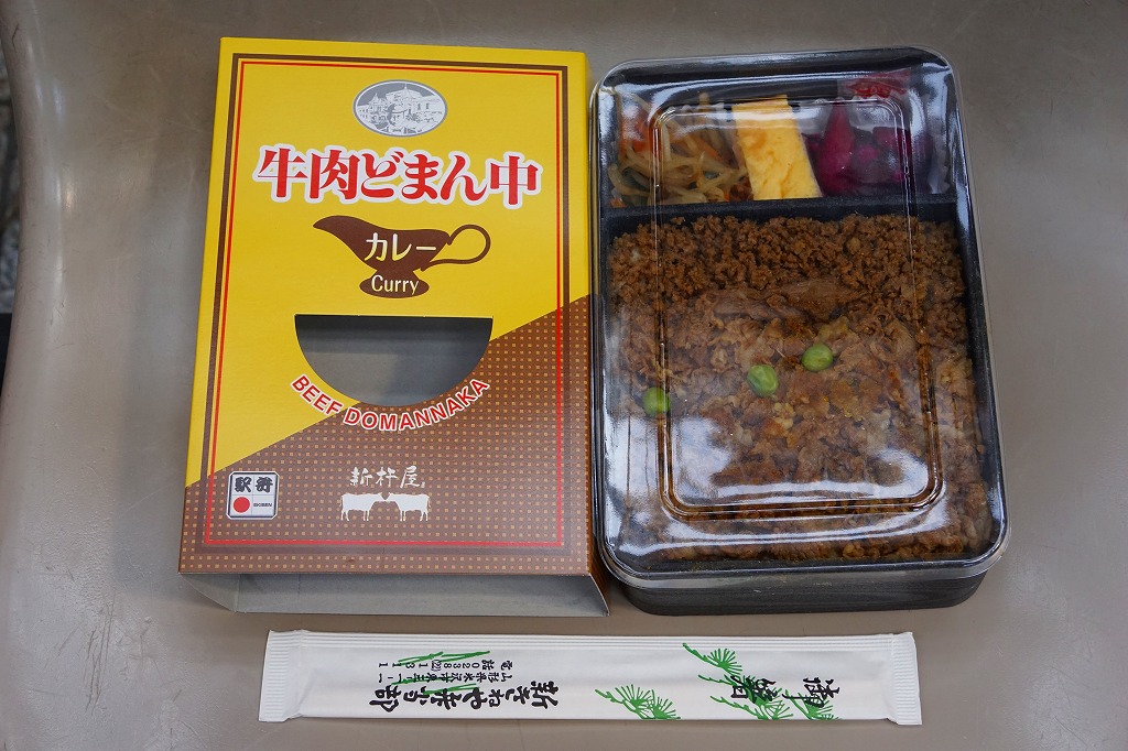 2015(平成27)年9月の発売。その前の8月8日に、東京駅の駅弁売店「駅弁屋 祭」でデビュー。醤油味(通常版)、しお味、みそ味に続く、4種類目の「牛肉どまん中」。白飯を覆う牛肉煮と牛そぼろとカレー粉で味付け、パセリで彩り、かまぼこ、玉子焼、サトイモ、にんじん、にしん昆布巻、大根桜漬を付け合わせる。駅弁に関する過去の文献から、肉駅弁のカレー味は臭み消しという先入観があるため、味に定評のあるこの駅弁でのこの味はもったいないと思うところだが、肉の味が残る程度に淡い風味付けで、味は守られている。