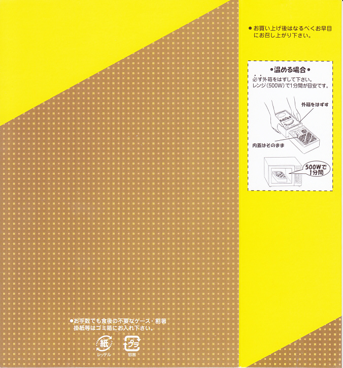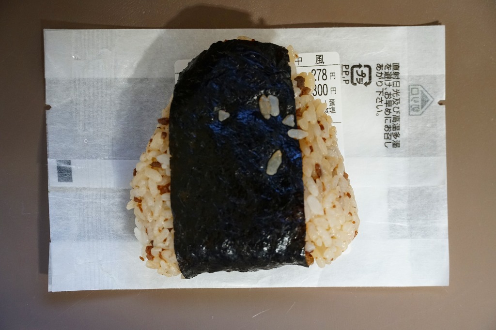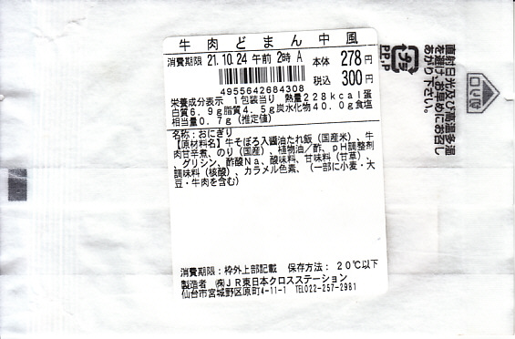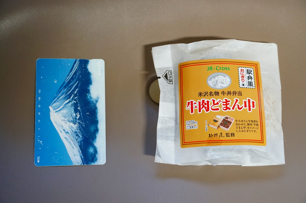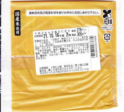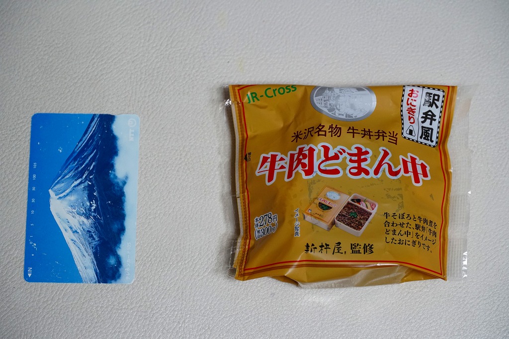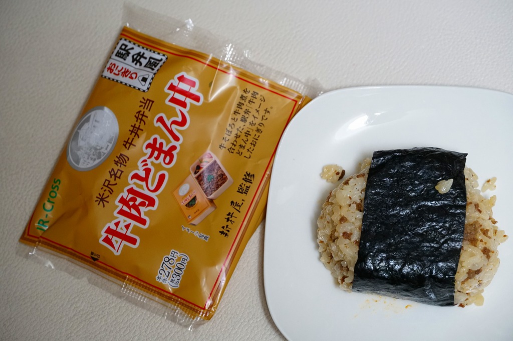 袋の絵柄は牛肉どまん中のスリーブに似せ、本物の見本写真も掲載。牛そぼろ入り御飯に牛肉煮を載せて海苔で巻いたものを1個袋詰め。確かにその風味と内容は、牛肉どまん中になんとなく似ていた。本物にはミニサイズがないので、こんなコンビニおにぎりが米沢駅などにあってもよいと思う。