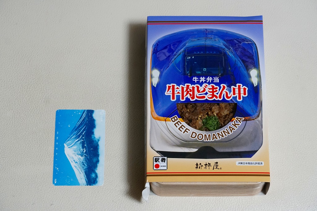 2024(令和6)年9月に山形駅で発売か。米沢駅の名物駅弁「牛肉どまん中」について、スリーブの絵柄を同年3月にデビューした山形新幹線向けE8系新幹線電車にしたもの。容器や中身に味や価格は、通常版と変わらない。