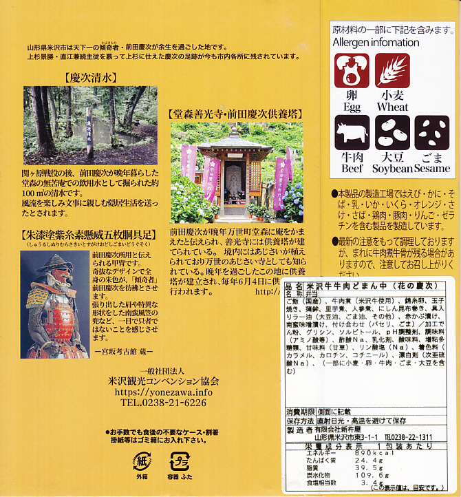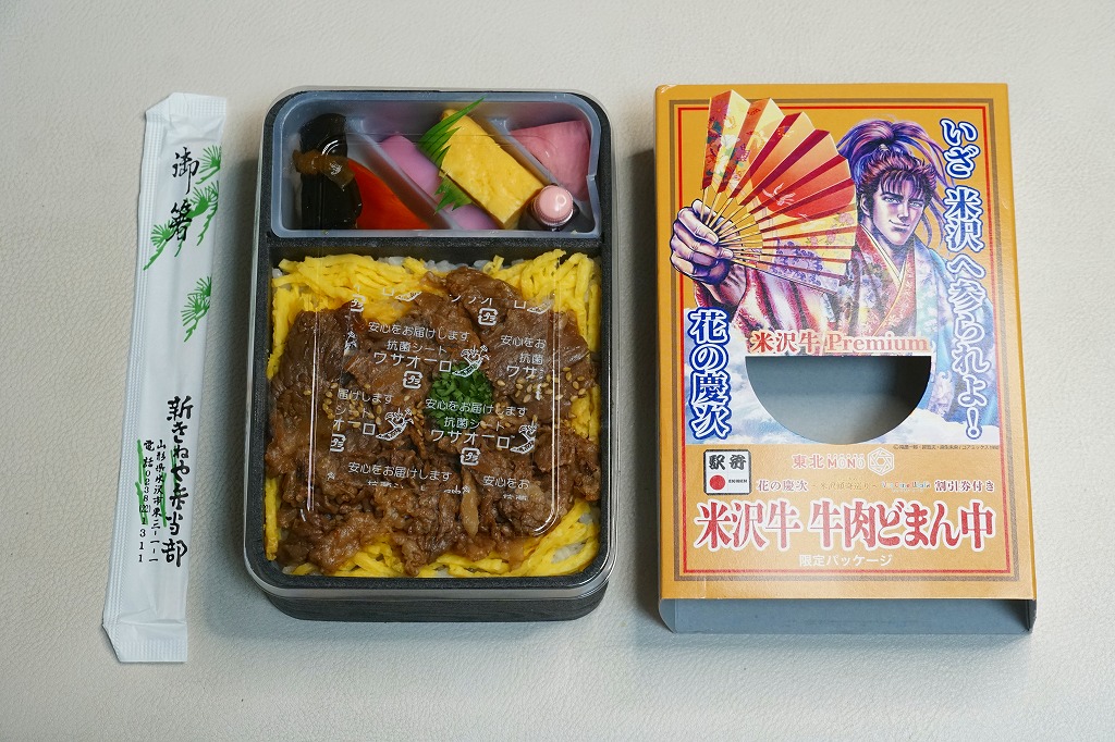 スリーブの絵柄は、2011(平成23)年1〜6月に販売された牛肉どまん中「慶次400thメモリアルパッケージ」と同じ。これにJR東日本の観光キャンペーン「東北MONO」のアイコン、ボイシネウォーク『花の慶次〜米沢傾奇(かぶき)巡り〜』の300円引きクーポン、前田慶次にちなむ名所案内を加えた。中身は普段の牛肉どまん中の牛肉を米沢牛に置き換えたのではなく、白飯を太めの錦糸卵で覆い、牛焼肉とパセリを載せ、昆布巻、にんじん、かまぼこ、玉子焼、大根漬、タレを添えて、通常版より骨太な感じ。日本の高級ブランド牛にしては、脂身が少なく赤身とその歯応えが勝ると思うが、これも米沢牛牛肉どまん中という駅弁の個性だろうか。価格は2021年の発売時や購入時で2,000円、2023年3月頃から2,160円。
