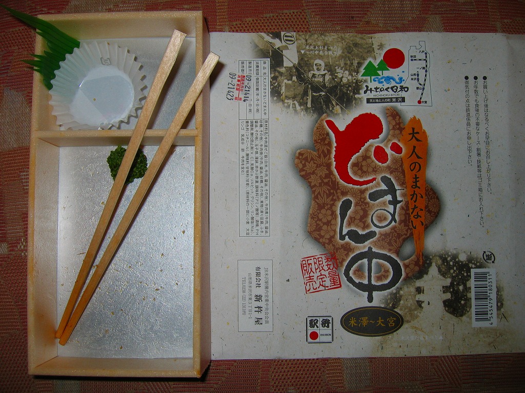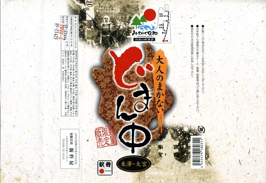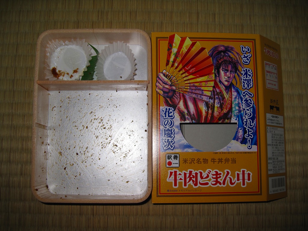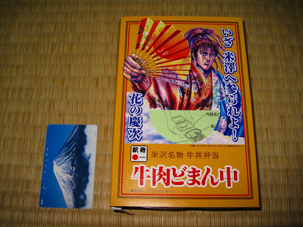 2011(平成23)年1月10日に購入した、米沢駅弁のスリーブ。米沢ゆかりの戦国武将である前田慶次の400年忌にちなむ記念事業の一環として、2011年1月から6月頃までこのパッケージを採用した。パッケージ表面下部にも「慶次400thメモリアルパッケージ」と書かれている。中身や価格は普段と変わらない。これに描かれたキャラクターそのものは、1990年代に集英社の漫画雑誌「週刊少年ジャンプ」で連載された「花の慶次」の主人公。1980年代に社会現象となった「北斗の拳」と同じく、原哲夫氏の作画による。