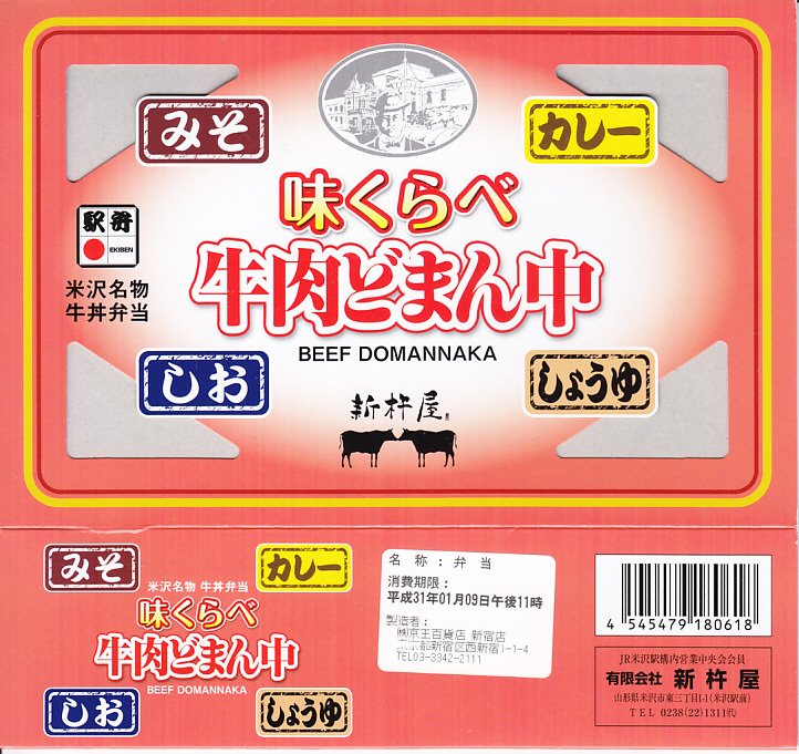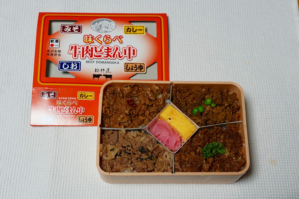 2019(平成31)年1月の京王百貨店の駅弁大会での実演販売で生まれた駅弁。3年前の「三味牛肉どまん中」では、「しょうゆ(通常版)」「しお」「みそ」の3種の牛肉どまん中を入れたが、今回は「カレー」を加えて4種の牛肉どまん中を詰め合わせた。玉子焼と大根桜漬の付合せはセンターに配置。催事場内ではそこそこの人気を得ていたと見えた。以後も米沢駅前の調製元での注文販売で入手できた。1年間ほどの販売か。
