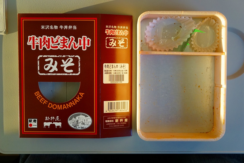 上記の駅弁「牛肉どまん中みそ」の、2014(平成26)年時点での姿。上記の10年後の2024年のものと、だいたい変わらない。「米沢名物」の有無や調製元のロゴマークにスリーブの側面やおかずのトレーに差異がある程度。