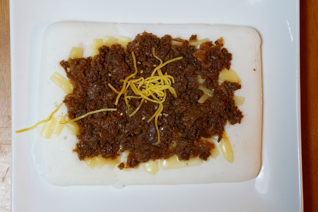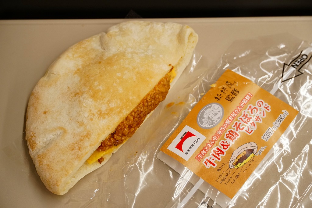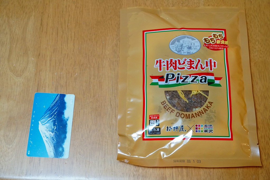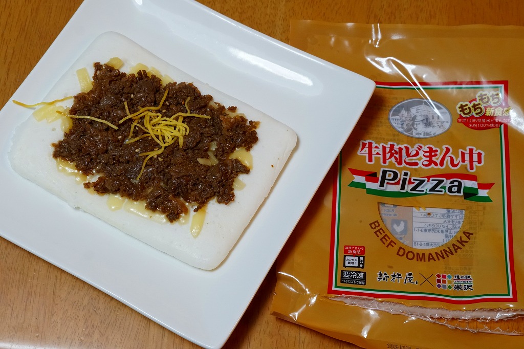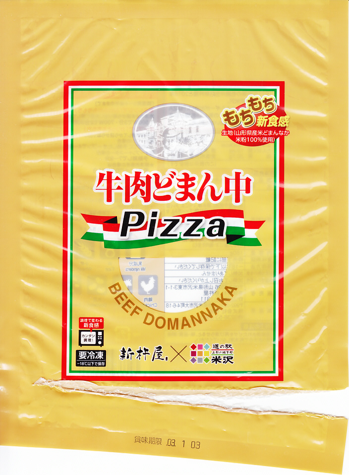 山形米「どまんなか」の米粉を100%使う白く四角い生地に、牛そぼろとチーズを載せて、駅弁の牛肉どまん中に似た絵柄の袋に詰めて冷凍する。自然解凍の状態でいただくと、ふんわりしっとりした生地に味の濃い具が合った。分量に比して高額な印象はある。製造者は米沢市街の持ち帰りピザ屋「PIZZA Ktarou」。