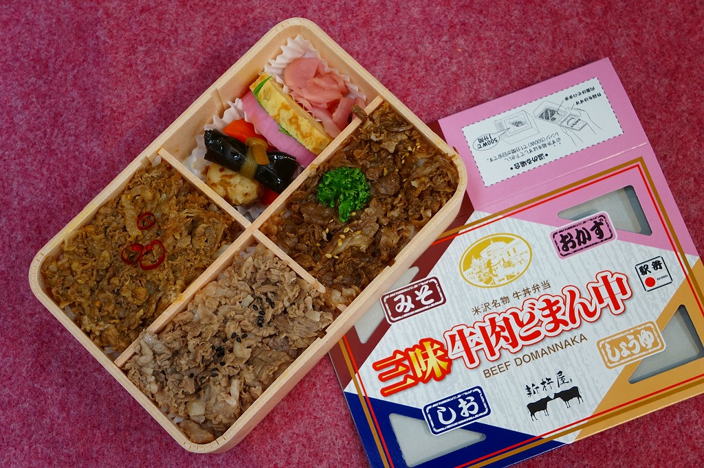 2016(平成28)年1月の京王百貨店の駅弁大会での実演販売で生まれた駅弁。その後も要予約や輸送販売の商品として売られた模様。同年10月のJR東日本の駅弁キャンペーン「駅弁味の陣」で、米沢駅弁としてデビューした。内容は上記の駅弁「牛肉どまん中」「牛肉どまん中しお」「牛肉どまん中みそ」と、これらとおなじ付合せの組合せ。3種の駅弁を食べくらべるなど、テレビ番組や駅弁マニアでしかやらない、やれないだろうから、普通の方々向けにこんなセット販売があってもよい。価格は2016年の発売時で1,300円、2019年時点で1,350円、2023年3月頃から1,500円。