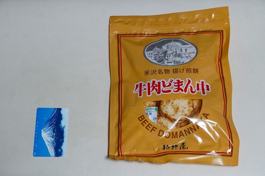 2021(令和3)年4月に新発売。米沢駅弁の調製元と茨城県真壁の米菓製造販売業者との共同開発商品。米沢駅と日本を代表する有名な駅弁「牛肉どまん中」を揚げ煎餅にした。その袋の絵柄は駅弁のスリーブと同じで、よく見ると「米沢名物牛丼弁当」の箇所を「米沢名物揚げ煎餅」に書き換える。中身は小粒の揚げ煎餅。牛肉どまん中の調製で牛肉を煮たタレと山形県産のお米を使うというが、味は普通のスーパーで買える普通の揚げ煎餅と変わらない。小粒で固くなく食べやすいとは思う。価格は2021年時点で350円、2022年時点で380円。