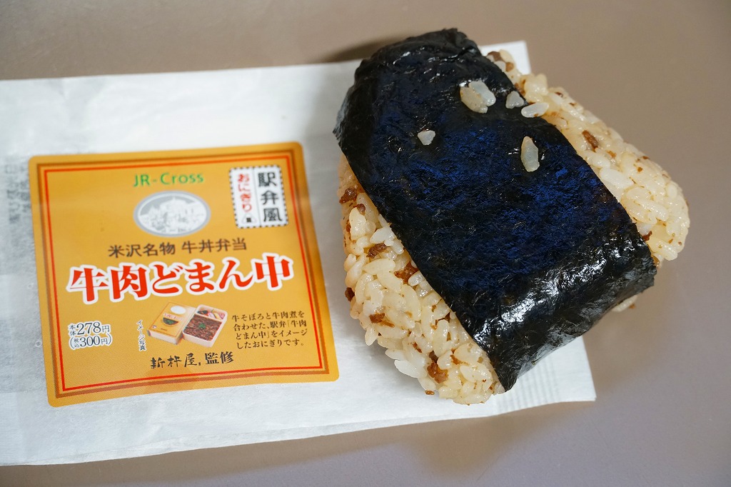 2021(令和3)年10月12日から11月1日まで、JR東日本の駅のコンビニ「ニューデイズ」で販売。10月14日の鉄道の日にちなみ、駅弁会社が監修する「駅弁風おにぎりシリーズ」として、山形県の米沢駅「牛肉どまん中」、兵庫県の西明石駅「ひっぱりだこ飯」、東京都の東京駅「チキン弁当」の3種類を、コンビニおにぎりにして販売した。調製は地域ごとの取引先の食品会社と思われる。