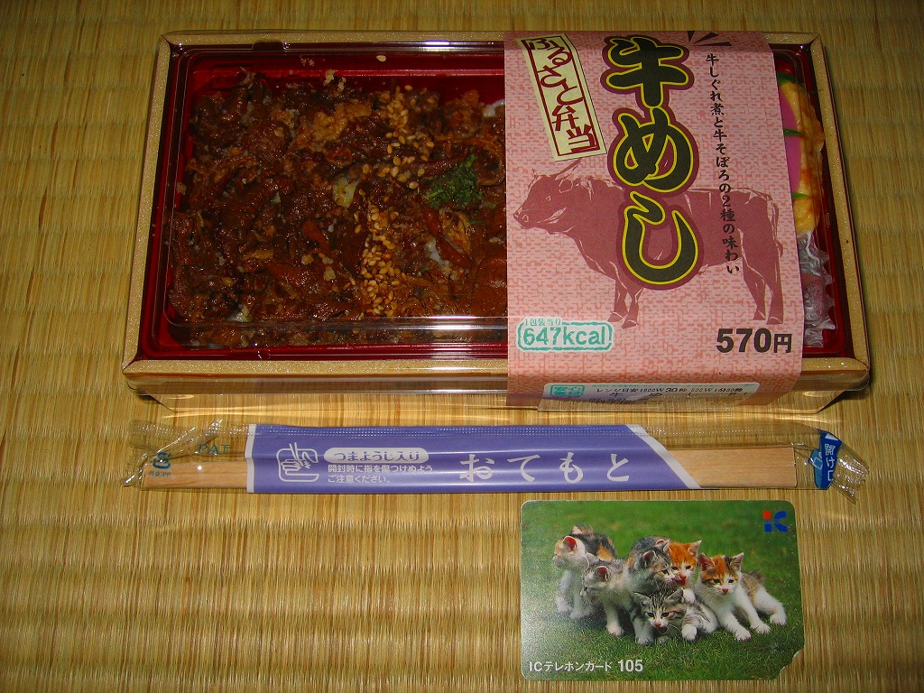 本物の駅弁でも使われる、トレーを接着した容器に透明なふたをして、商品名を書いた掛紙を巻く。中身は白御飯の上に牛そぼろと牛しぐれ煮を敷き詰めて、これに玉子焼とカマボコと昆布巻と人参煮を付けるもの。内容も見栄えも駅弁を再現できていると思うが、味はやっぱりコンビニ弁当。以後、北海道の「豚めし」(600円)、東京の「深川めし」(530円)、仙台の「牛タン弁当」(590円)、横川の「鶏と牛蒡のわっぱめし」(530円)、高崎の「山の恵みわっぱめし」(520円)と続いたそうな。
