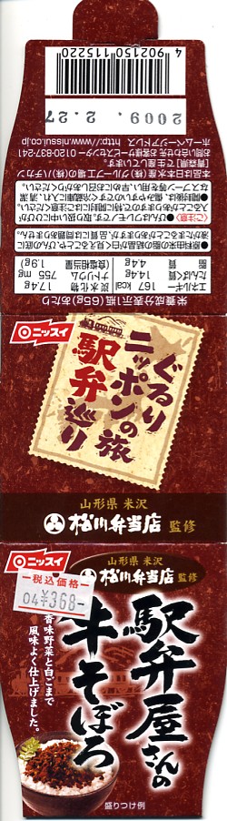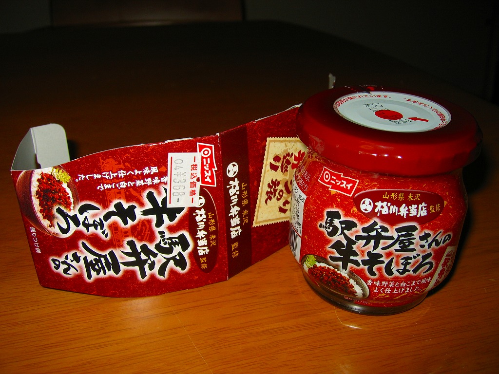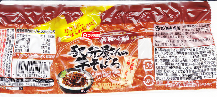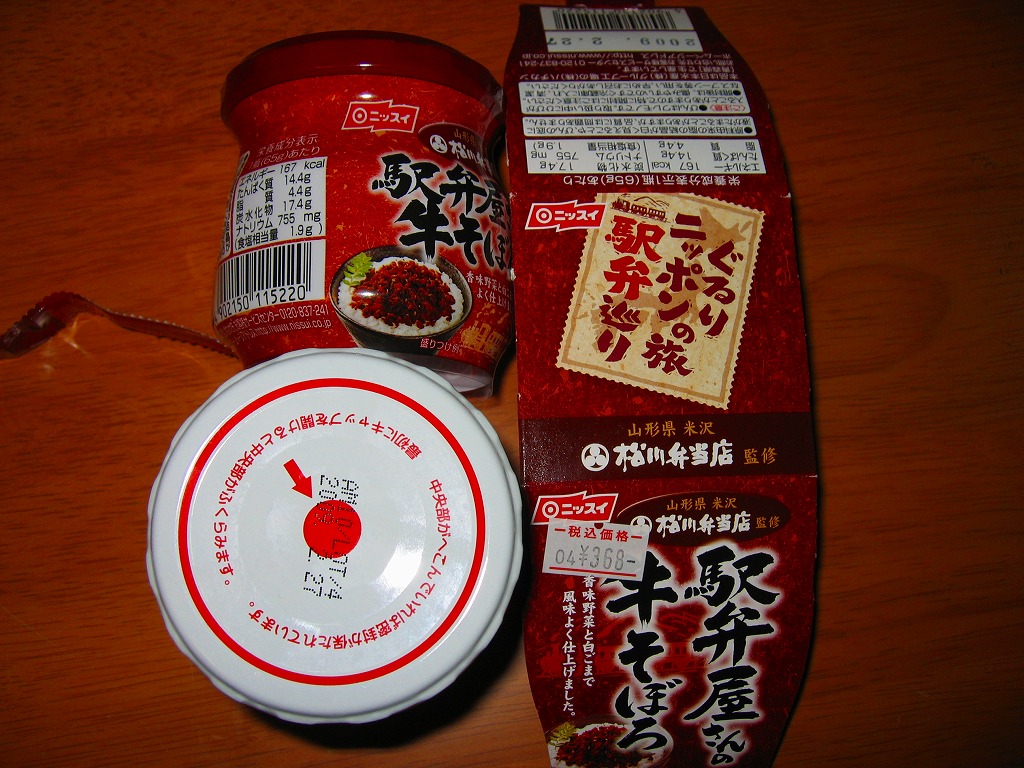 上記の商品「駅弁屋さんの牛そぼろ」の、2021年時点での姿。都城などのバージョンはすでになく、他の版や新作が出るわけでもなく、この米沢のみが十数年も売られ続ける息の長い商品となっている。スリーブはなくなり、分量は65グラムから55グラムに減らされステルス値上げとなったが、中身は変わらない。話題にならないが、ネットでも買える。価格は失念したが300円台か。