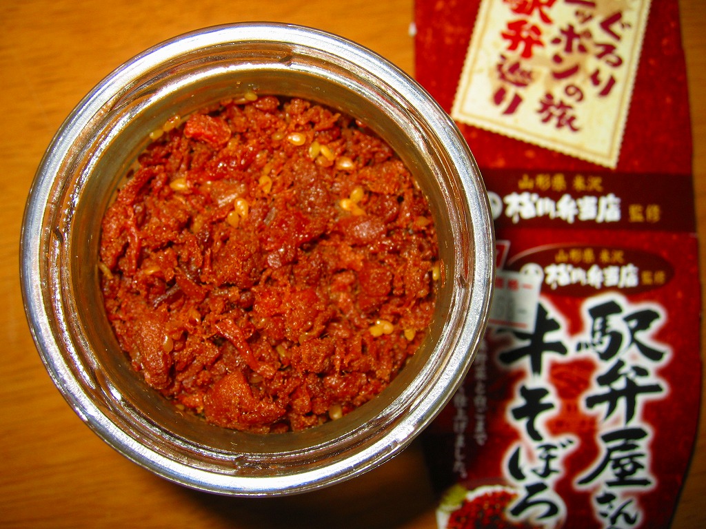 2008(平成20)年3月1日に釧路、八戸、米沢、都城の4種が誕生した駅弁屋の監修によるレトルト弁当の派生商品として、米沢と都城の2種で出た瓶詰め。甘辛く煮た牛フレークが詰まった瓶を、レトルト弁当と意匠を合わせたのボール紙の枠にはめる。食べればなるほど、米沢駅弁の味。