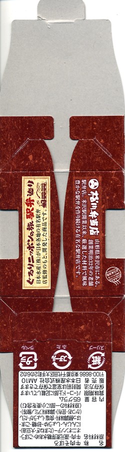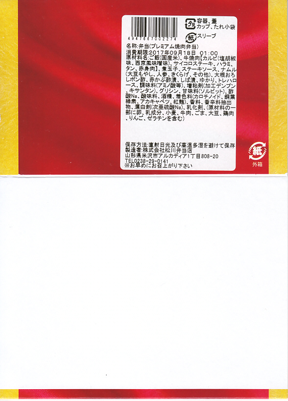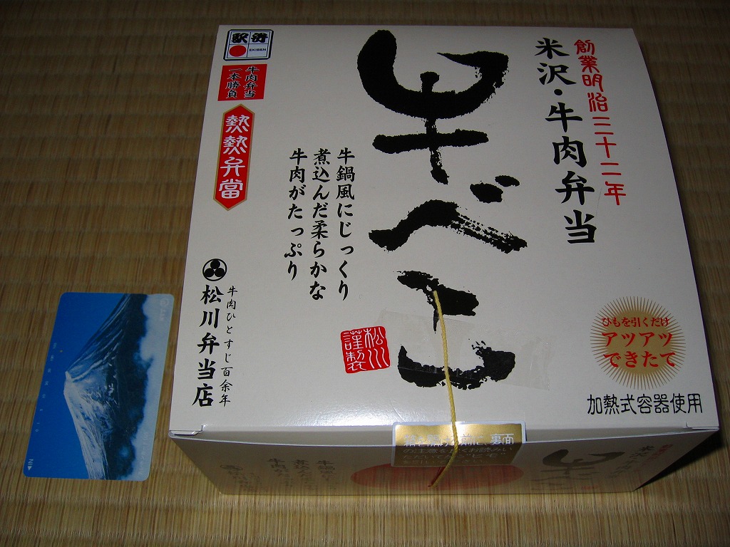 米沢駅の牛たん弁当の、松川弁当店版。小判型の容器をオレンジ色のスリーブに収める。中身は白御飯の上に牛たんの味噌焼を貼り、様々な漬物を添えるもの。牛たんの見た目と味は、人気で有名な仙台駅の駅弁よりも野暮ったい感じ。見栄えがするパッケージの記述「美味舌賛」「二枚舌」に、洒落っけが効く。2007年頃までの販売か。