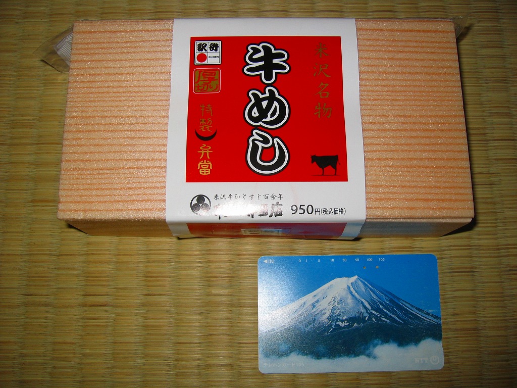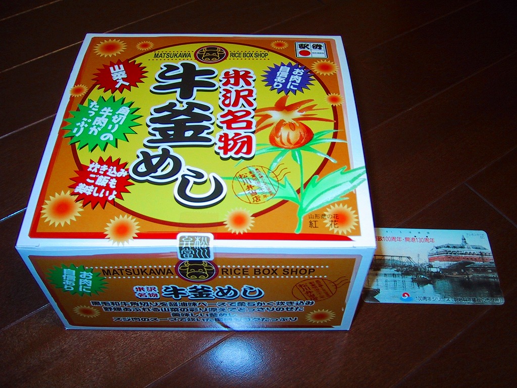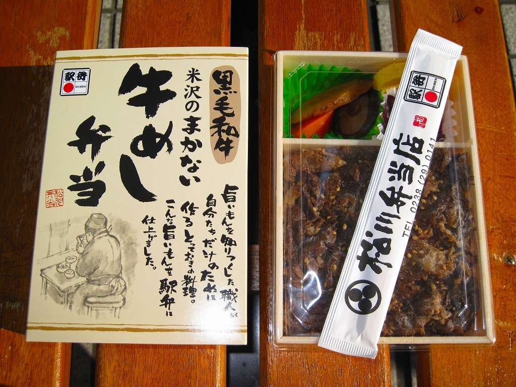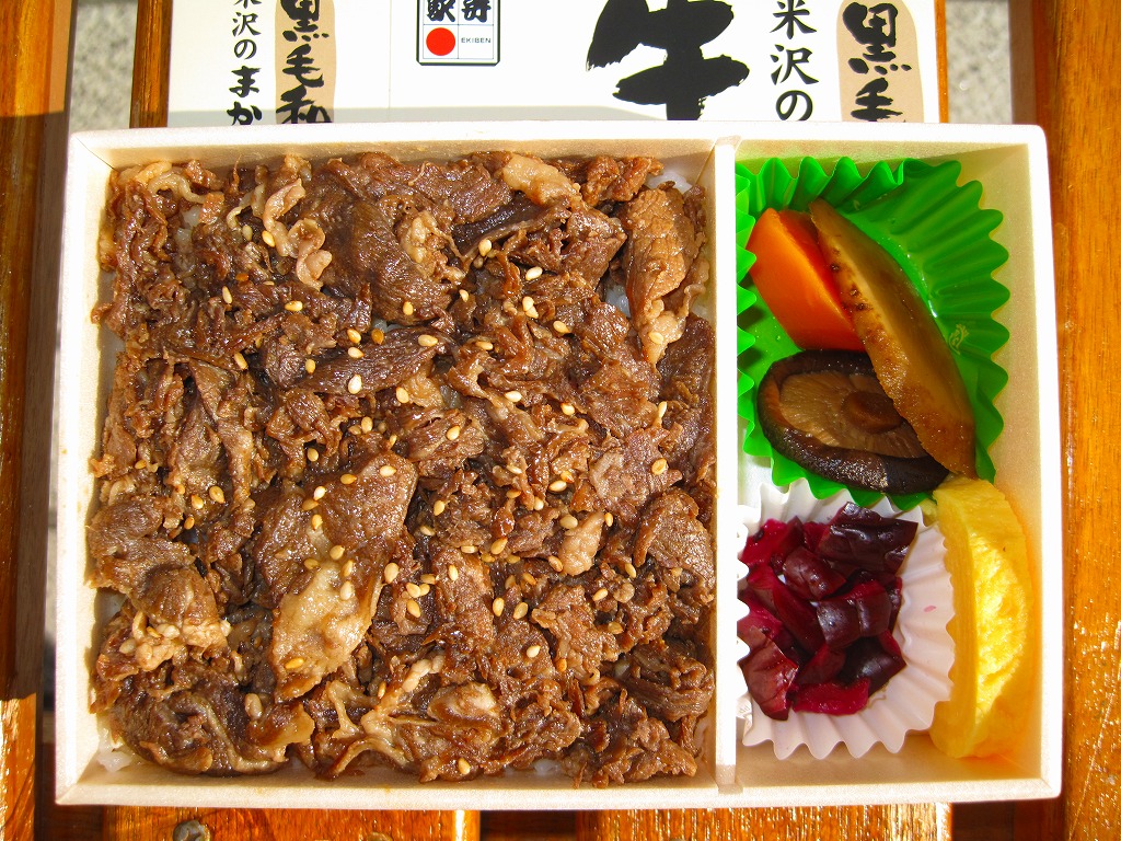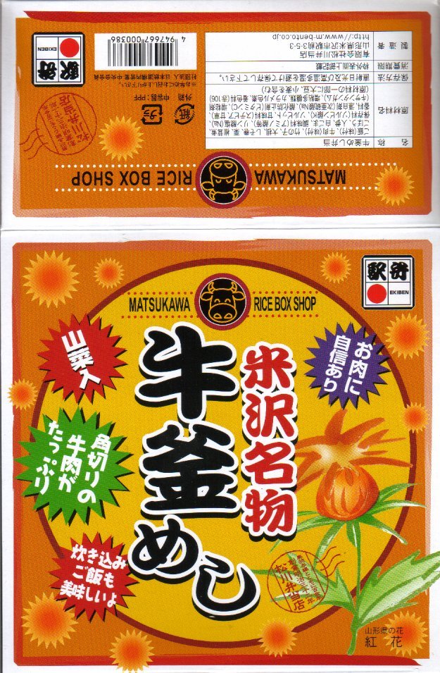 ボール紙の立体パッケージに小さな長方形の木目調容器を入れる。中身は酢飯の上に赤い紅花と黄色い吾妻菊と青いうこぎを信号機の順番で混ぜた柔らかな牛肉の板が載るもの。ステーキでも焼肉でもミンチでもない肉は不思議な食感で、少なくとも他の米沢駅牛肉駅弁よりはかなりあっさりしている。2005年頃までの販売か。