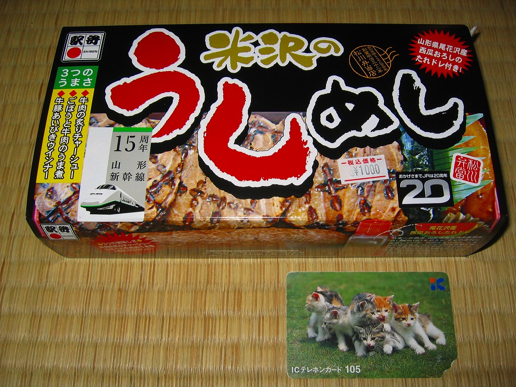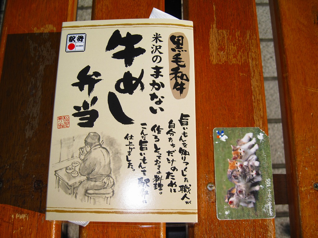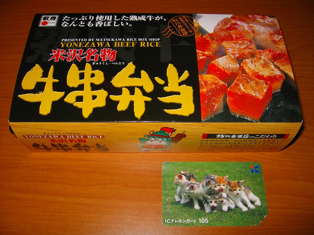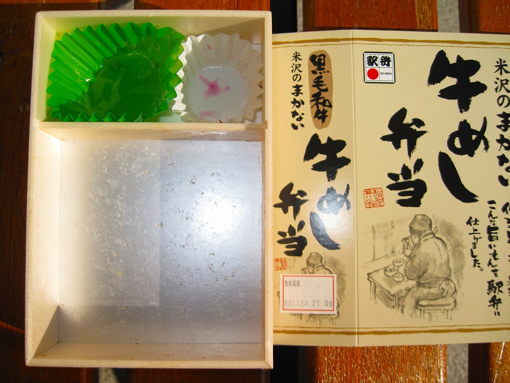 ボール紙の立体パッケージに小さな長方形の木目調容器を入れる。中身は酢飯の上に赤い紅花と黄色い吾妻菊と青いうこぎを信号機の順番で混ぜた柔らかな牛肉の板が載るもの。ステーキでも焼肉でもミンチでもない肉は不思議な食感で、少なくとも他の米沢駅牛肉駅弁よりはかなりあっさりしている。2005年頃までの販売か。