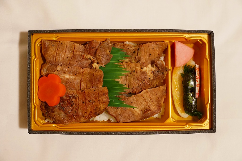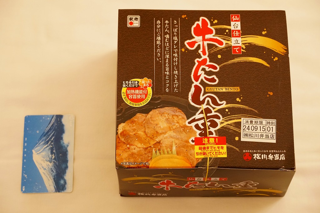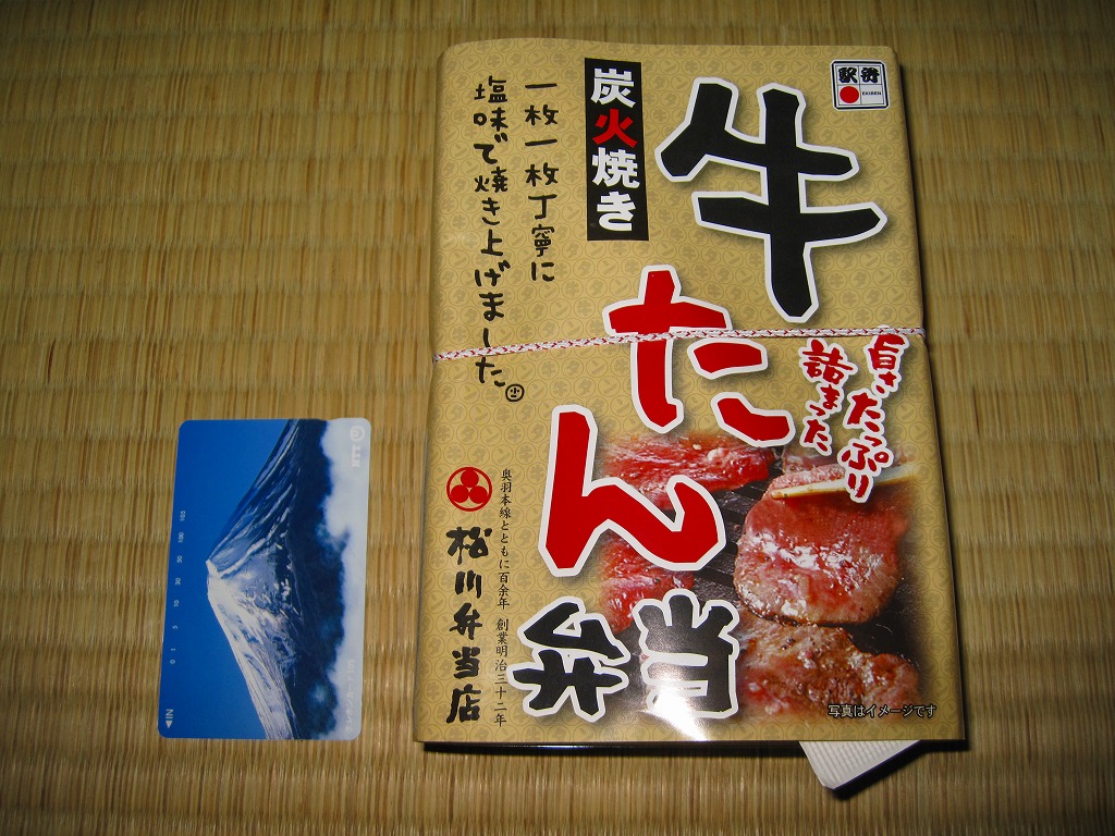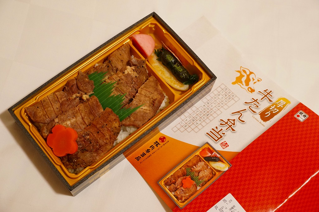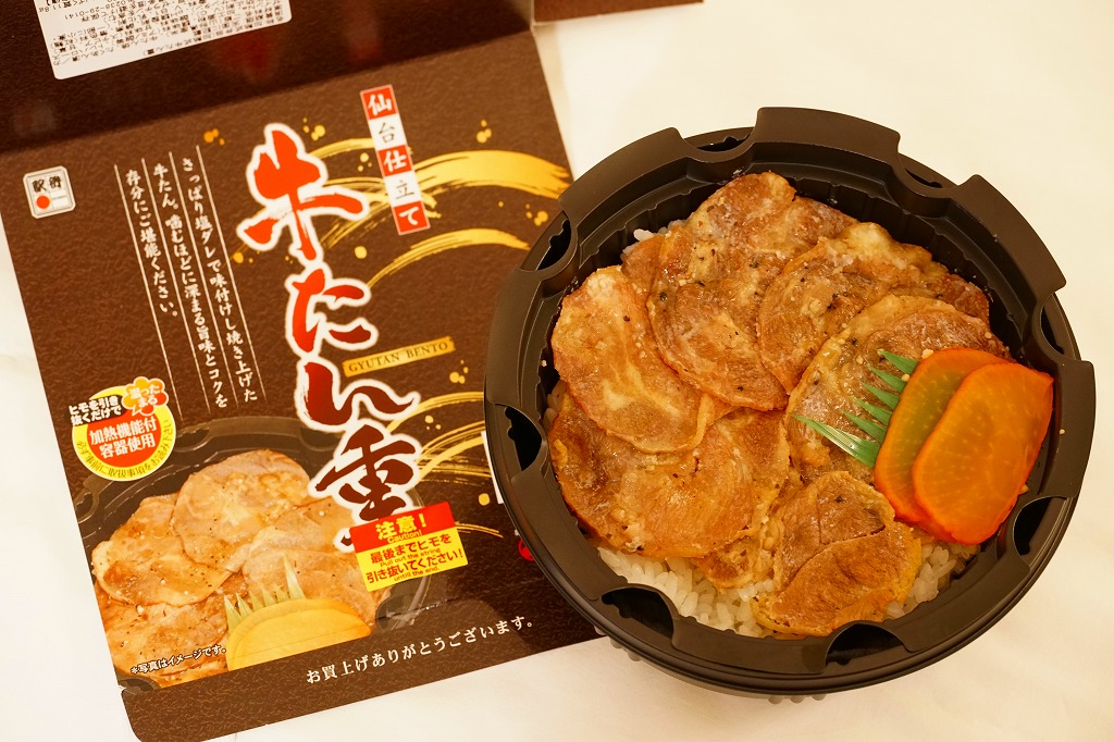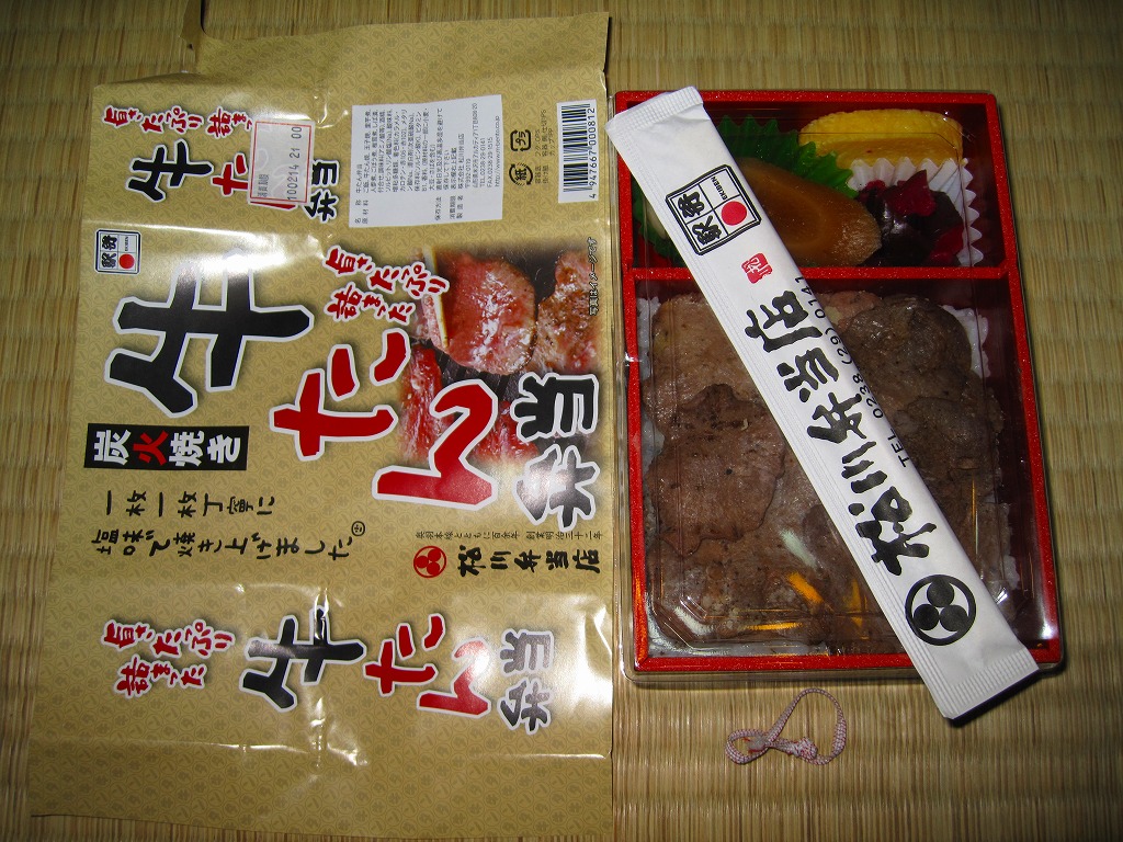 秋冬の駅弁大会シーズンに向けた、2009(平成21)年秋の新商品か。長方形で黒塗りの赤い容器に透明なふたをして、商品名と牛タン焼肉の写真を書いた掛紙を巻き、ゴムで留める。中身は白御飯の上に牛タンの塩焼きを貼り付けて、玉子焼や煮物類や柴漬けを添えるもの。付合せの味付けが濃厚すぎて箸休めの役目を果たしていないが、適度な分量と固さと味付けを持つ牛たん塩焼きが御飯に合う。