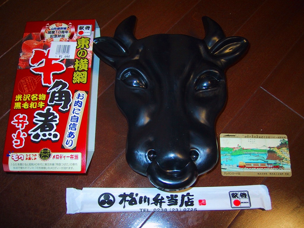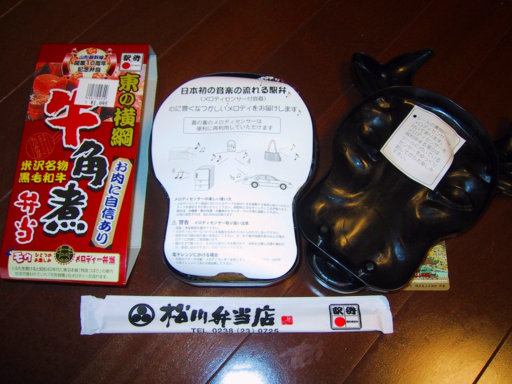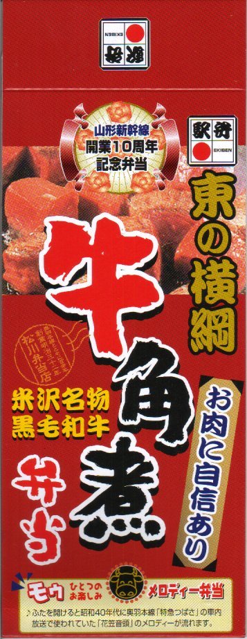 2002(平成14)年の秋に発売。真っ黒な牛顔型樹脂製容器に、お札のように掛紙代わりのボール紙を巻く。ふたを開けると「花笠音頭」の電子音が流れてメロディセンサーの注意書きが登場、それを取ると、白御飯の上に牛角煮を8個載せてゴボウなどを添える中身が出てくる。中身はいわば「牛串弁当」から串を外したものなので、味は同等、胃腸に重量感のあるヘビーな駅弁だ。容器は三重県の松阪駅「松阪牛モー太郎弁当」との共同プロデュース。価格は2003年の購入時で1,150円、2010年時点で1,250円、2014年時点で1,300円。2022年までの販売か。
