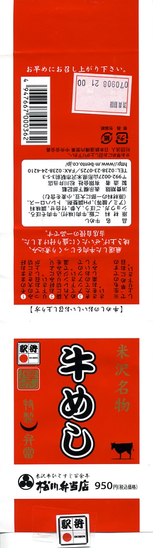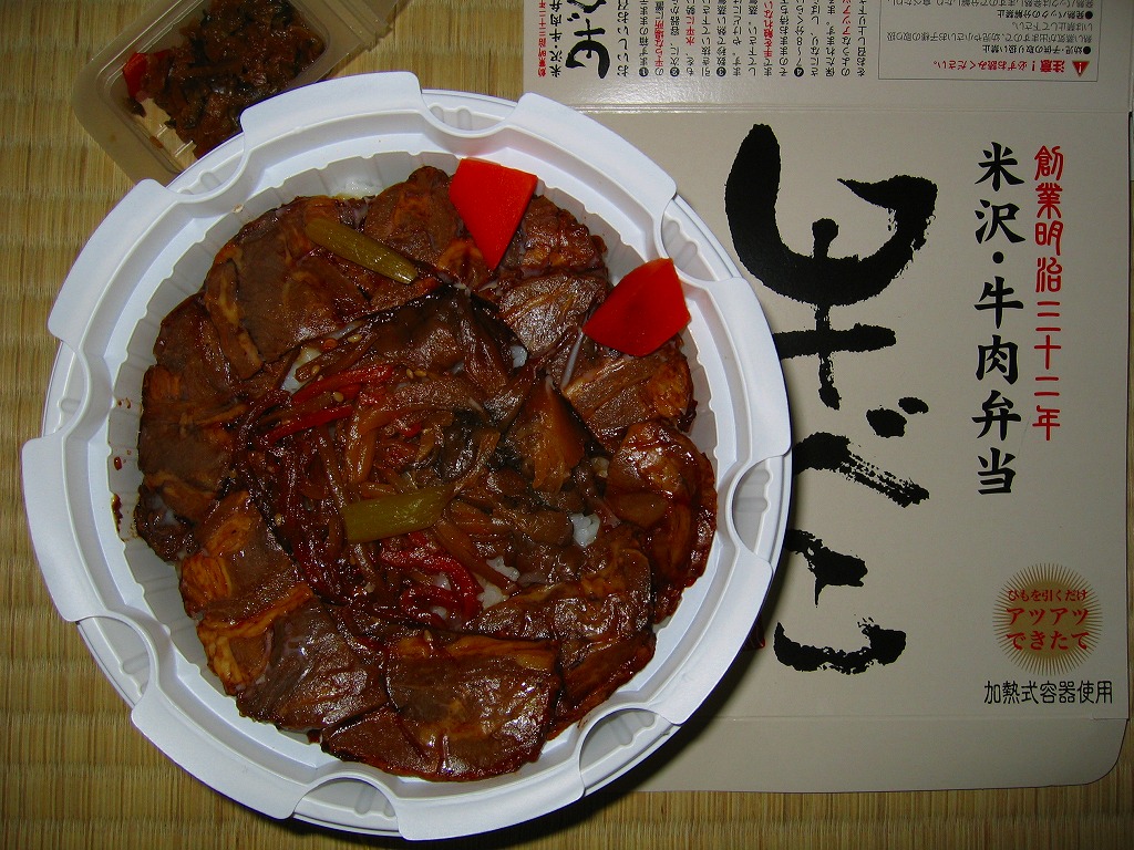 ヒモを引いてから食べるまでの時間が短かったか、熱が肉まで回っていなかったが、常温で食べてもアツアツと変わらなそうな味。最近の駅弁催事で大きな顔をする加熱式米沢駅弁の中でも比較的初期に出たはずなので、常温で味を生かす駅弁屋の技術をベースに作られたのではと思う。2016年時点で現存不詳だったが、2021年時点で要予約商品として調製元が公式サイトに掲載。2021年春に廃盤か。