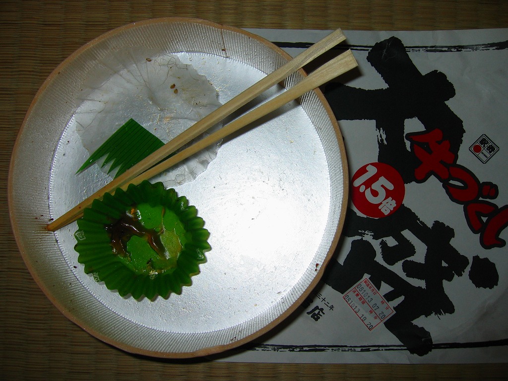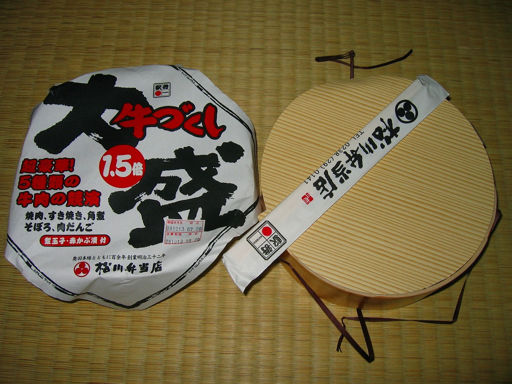 木目調の小さな容器に、商品名を書いた掛紙を巻く。真空パックになっている中身は、固結した棒状御飯に味付牛肉を貼り付けたもの。以前に買った「松茸入牛肉弁当」は不味かったが、こちらは牛肉のカルビ焼肉っぽい味が良好と感じた。しかし列車内で食べるものではない土産品であることは確かだろう。発売年も終売年も不詳。
