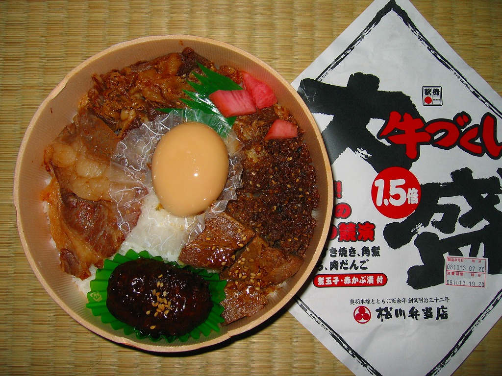 分量が通常版の1.5倍というが、米沢駅弁にこれと一致する商品はない。しかし中身は調製元の米沢駅弁に入っているものの詰合せであり、味も当然に同じ。容器の容積に比して控えめの御飯と盛りすぎの牛肉で大盛を演出していた、価格を考えても大満足の牛づくし。米沢駅や山形新幹線車内販売でレギュラー入りすれば、ライバルの「牛肉どまん中」に話題性で対抗できそうだと思う。