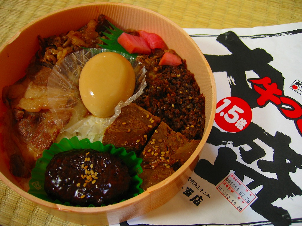 牛肉の味付けが生姜と醤油なのだそうだが、この調製元の他の牛丼駅弁に比べて、やっぱり間違い探しの範囲でしか違わない。味もその点では良好。こういうことをしないと、あるいはさせられないと、東京に見向きもされなくなってしまうしまうという危機感か、地元を離れて東京へ進出し成功したいという野心か、普通の駅弁屋にはあまり見られない背景を想像してしまう商品だと感じた。価格は2009年の購入時で1,050円、2017年時点で1,150円、2020年時点で1,200円。2019年頃までの販売か。
