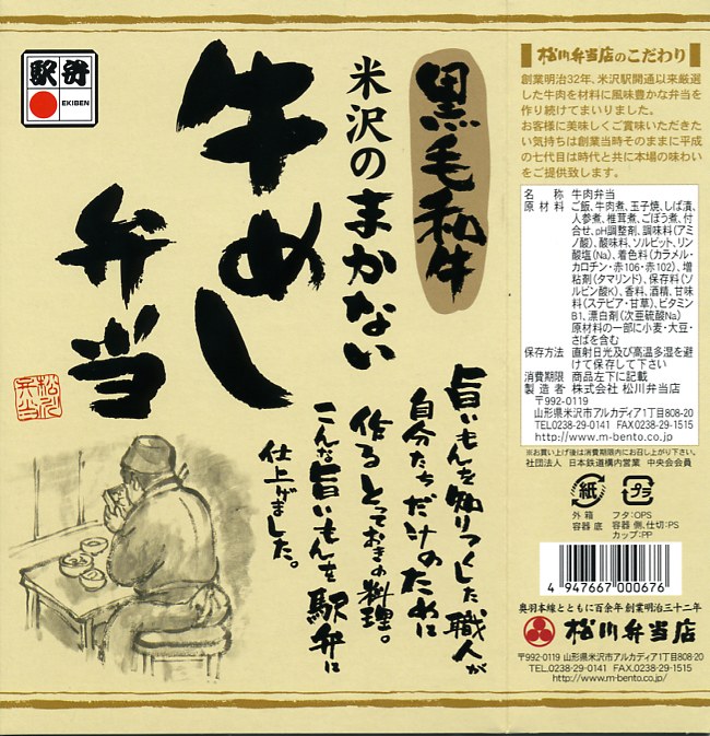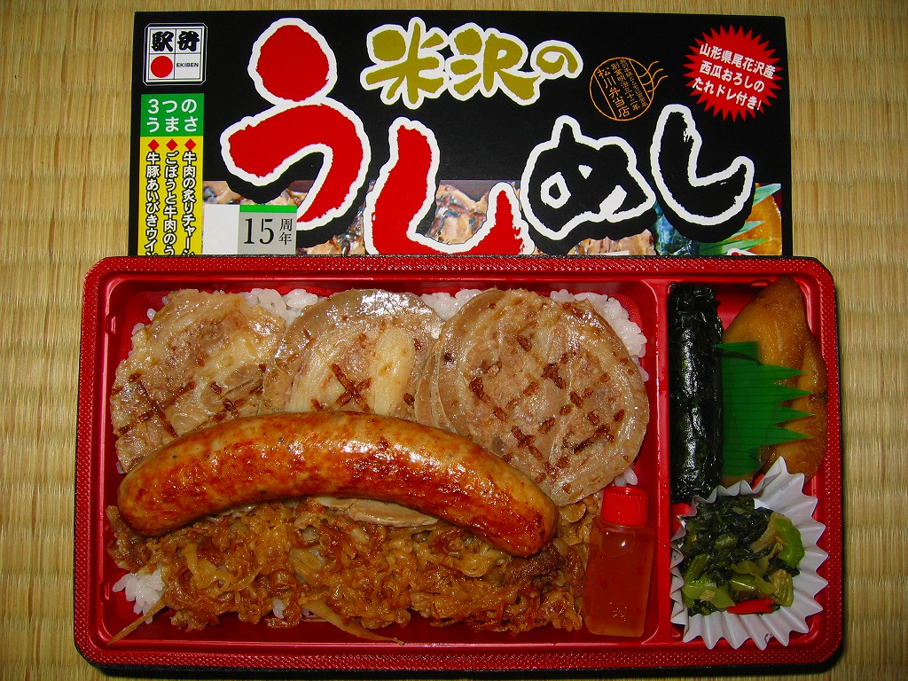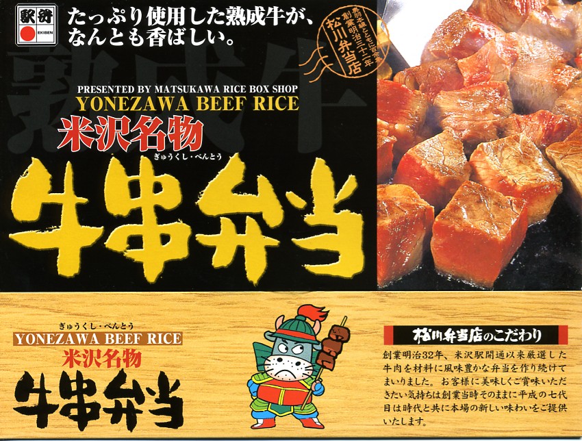 山形新幹線の開業15周年を記念して2007(平成19)年7月に発売した期間限定駅弁とされるが、その前から売られていた模様。長方形のトレー接着容器に黒いふたをして、駅弁の名前と中身の写真や宣伝文句を印刷して山形新幹線15周年シールを貼ったボール紙の枠にはめる。中身は白御飯の上に牛肉うま煮、薄切りの牛肉チャーシュー、牛豚合挽ウインナーを載せ、ごぼうと高菜と味噌しそ巻を添えるもの。