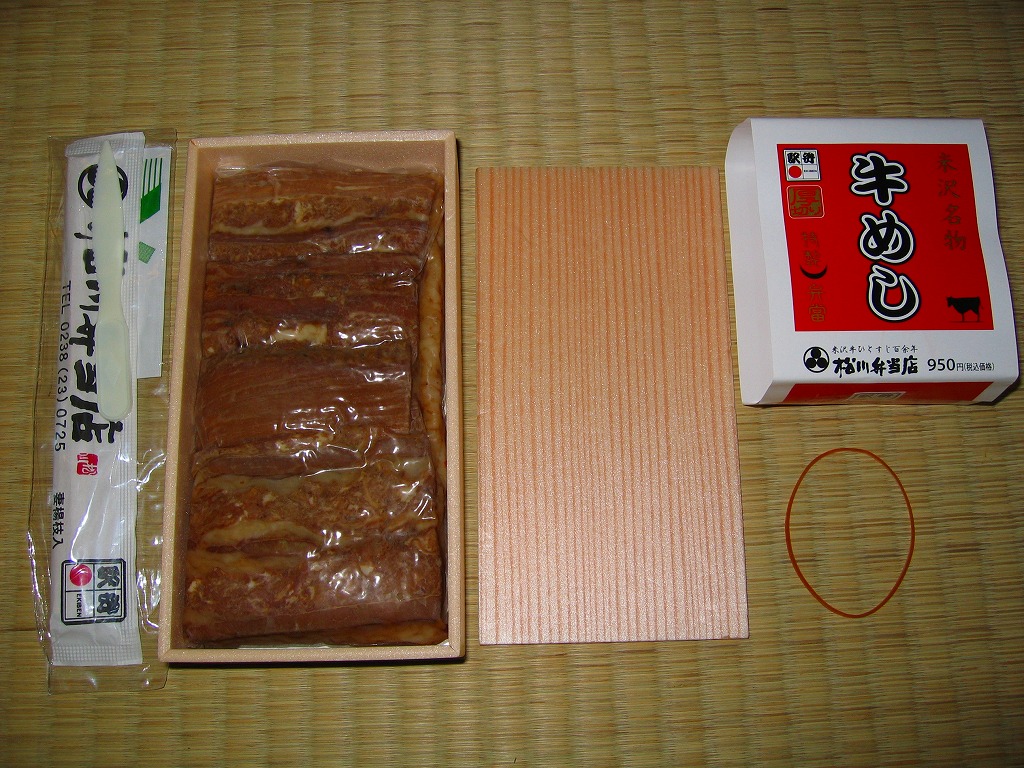 米沢でも全国でも牛丼か牛焼肉が定番の牛肉駅弁において、この内容は個性的。肉の薄さと柔らかさと脂の豊かさが御飯に合い、添付の尾花沢産スイカおろしだれをかけるとみずみずしさも出る。駅売りでも新幹線車内販売でもライバル業者の偉大な「牛肉どまん中」に隠れているが、偶然にこれを選んだ旅客からは絶賛される風味で、知名度を得れば対抗馬になり得る存在。2008年まで売られた模様。